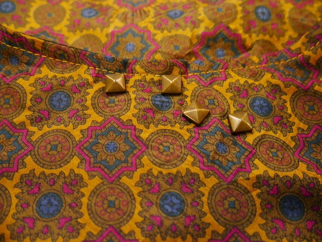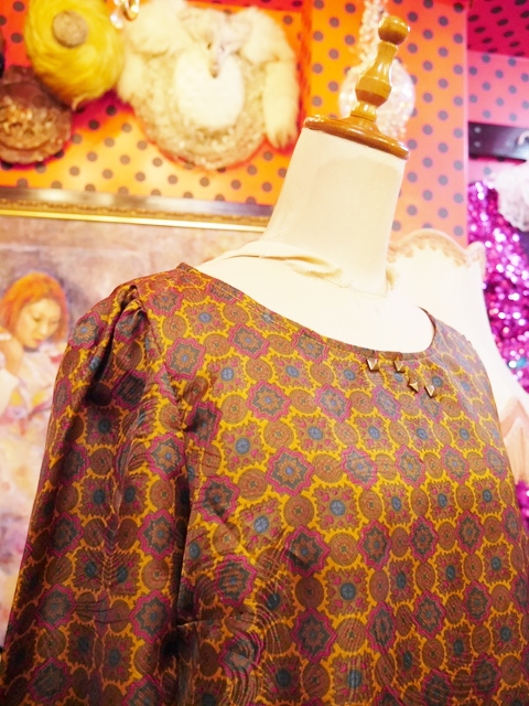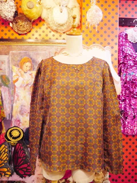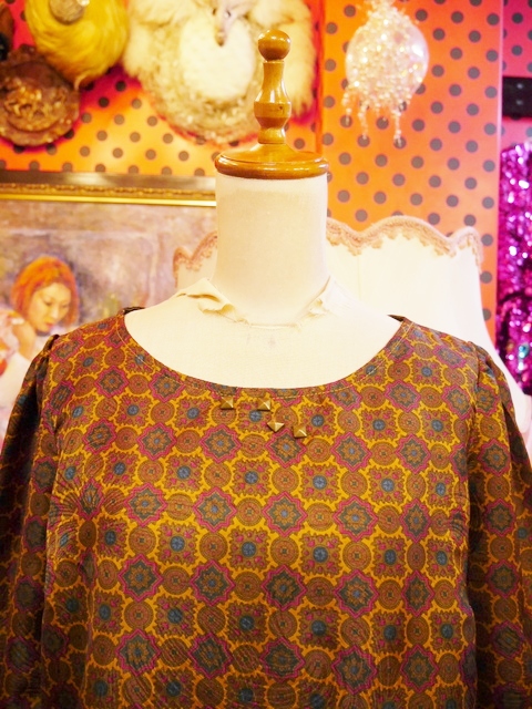 スパイラルのような模様入りの生地にアンティーク感漂うレトロモダン柄×胸元のアンティークゴールドスタッズが魅力的なヨーロピアンカットソー ブラウスと合わせてもお洒落なアイテム!