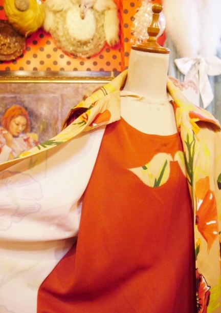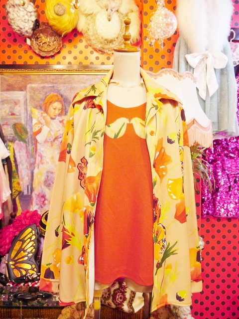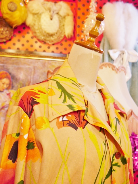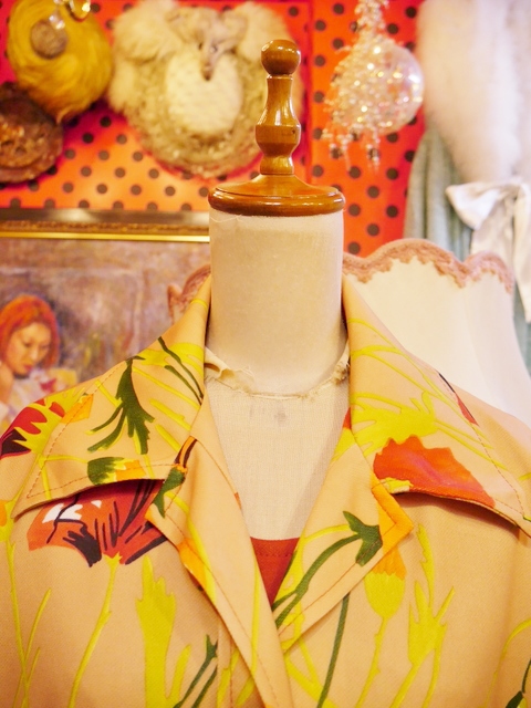 目を惹くカラフルな花柄模様に小鳥パッチワーク付きのインナーが可愛らしい1970年代頃のレトロブラウス セットアップ風デザインがお洒落ポイント!