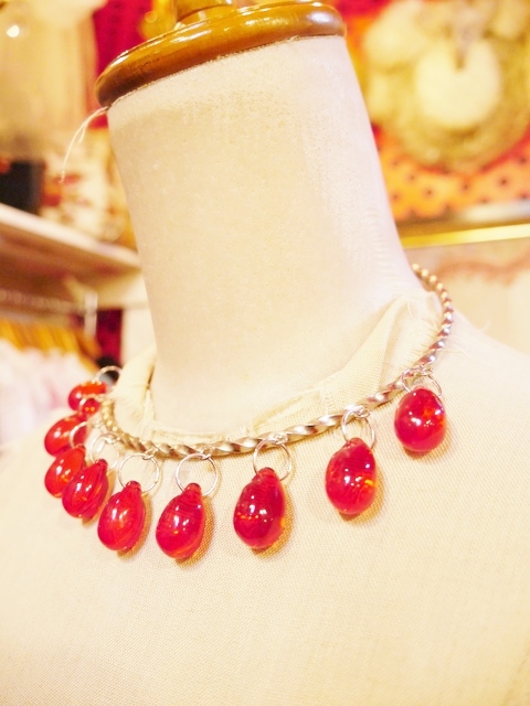 ユラユラ揺れるトランスペアレントな赤いサクランボデザインが魅力的な1960~70年代頃のヨーロピアンヴィンテージパーティーネックレス スタイリングを何倍にも輝かせてくれるベルギーで見つけたラグジュアリーアクセサリー