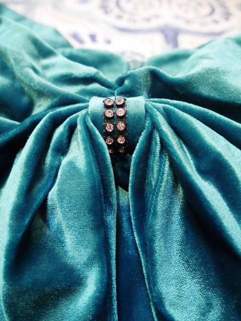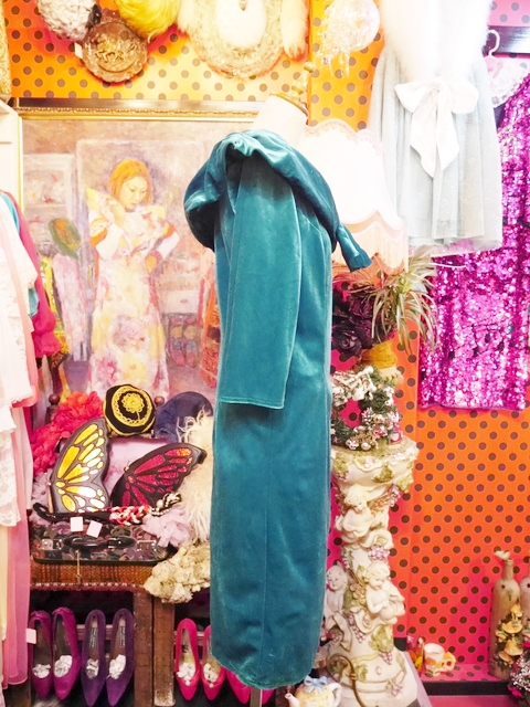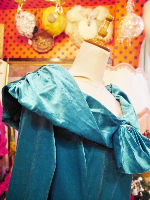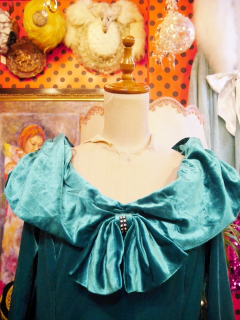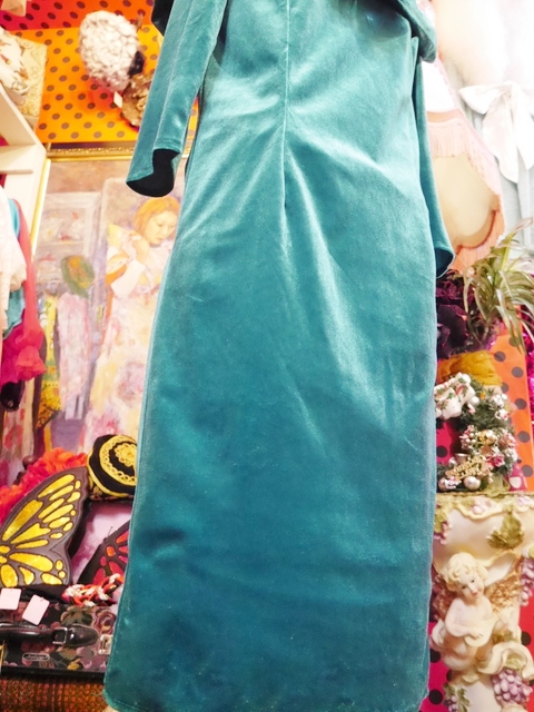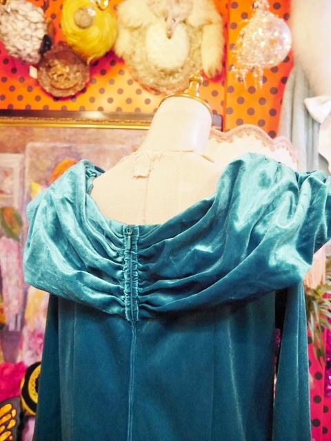 滑らかな光沢感がある濃エメラルドグリーン色ベロアのタイトなシルエットにエレガンスな印象のドレープ感があるケープ襟×ビジュー付きリボンが魅力的な1970~80年代頃のヨーロピアンパーティードレス アクセントのポイントにウエストマークもおススメ!★SALE★