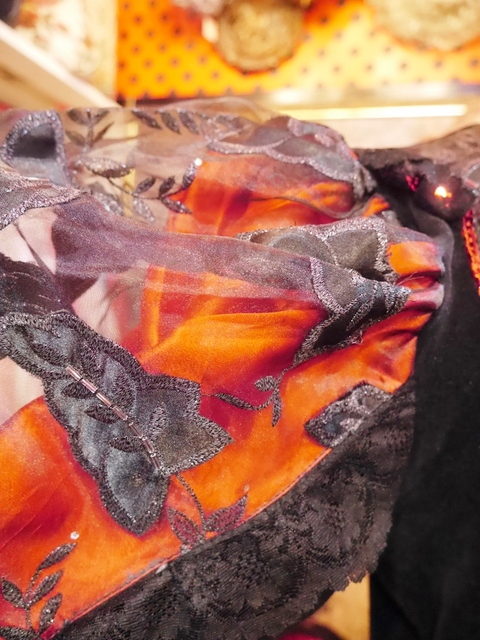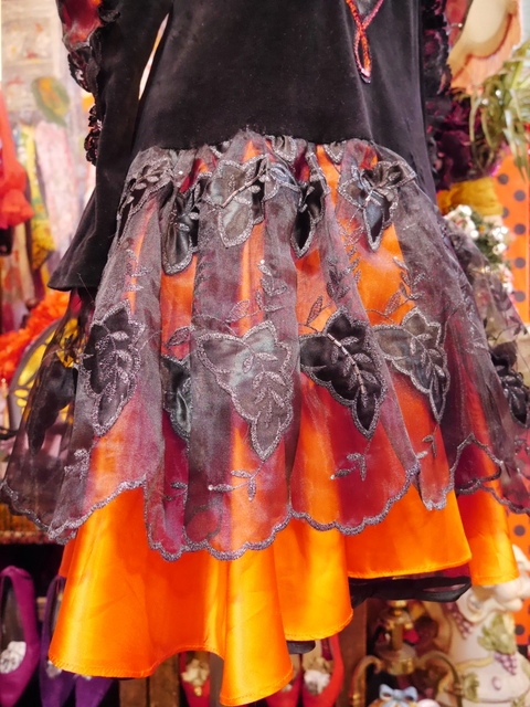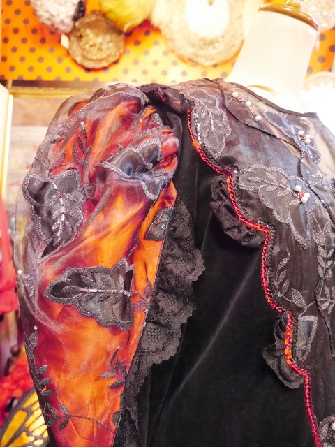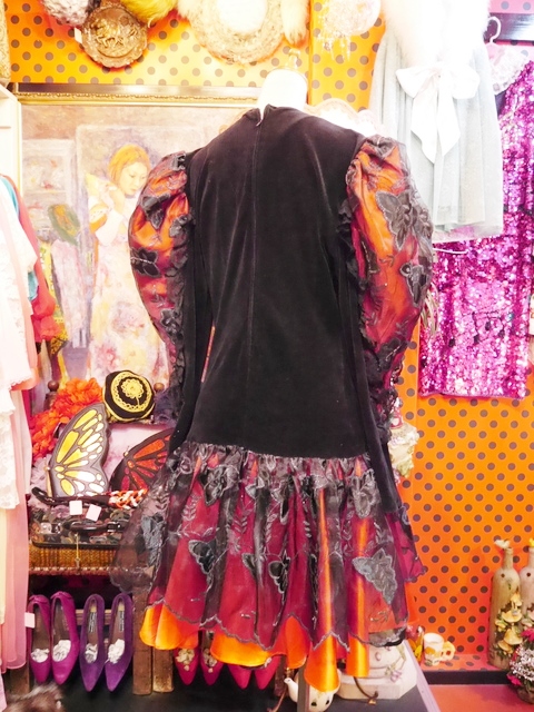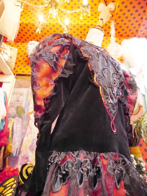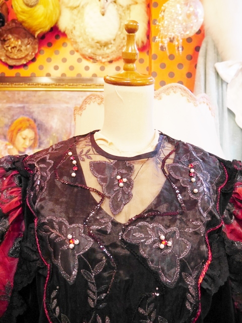 胸元のセクシーな透け感にリーフ模様刺繍やパール×ビーズの豪華な装飾デザイン、チュール、サテン、オーガンジーの3枚重ねのスカート、ギャザーやタックでふんわりと膨らみ肘下は細身なラインのレッグオブマトンスリーブなどディテールにこだわったお洒落で個性的なヨーロピアンヴィンテージベロアパーティードレス