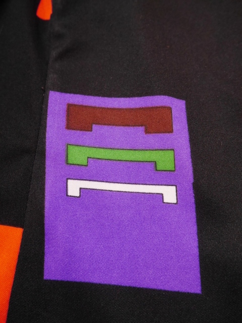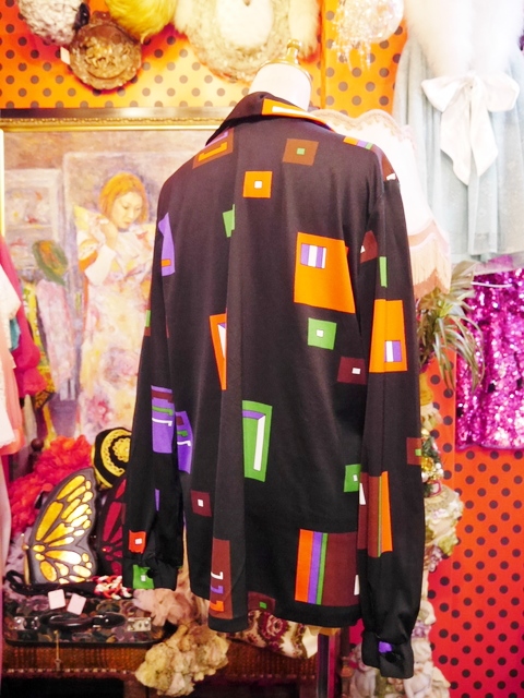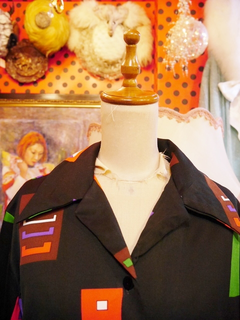 黒ベースにカラフルポップな幾何学模様がお洒落な1970年代頃のヨーロピアンレトロブラウス ベルボトムやビビッドカラーなボトムと相性◎!