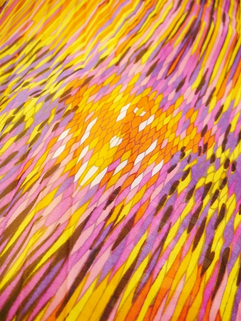インパクトたっぷりのアートなカラフルサイケデリック模様が魅力的な1970年代頃のヨーロピアンパーティーロングドレス アクセントのポイントにウエストマークもおススメ!