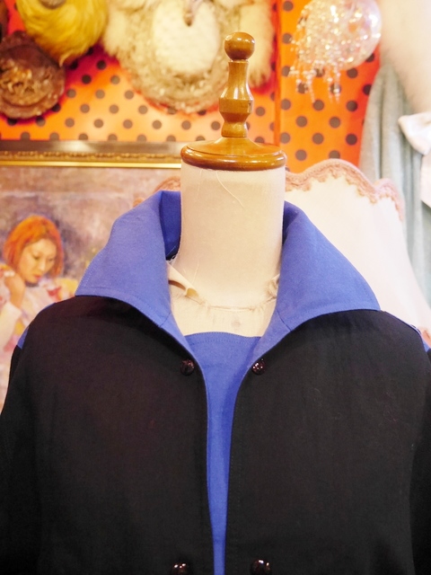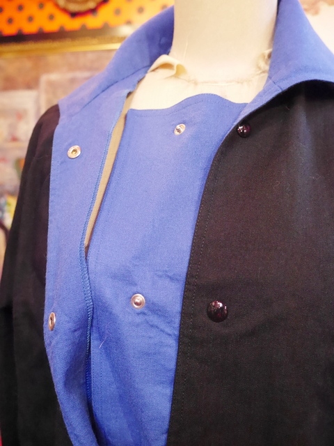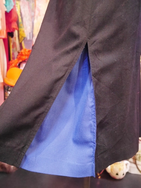 黒×ブルーの切替デザインがお洒落な1970年代頃のヨーロピアンヴィンテージウールワンピース アクセントのポイントにウエストマークもおススメ!