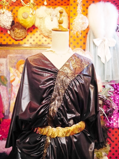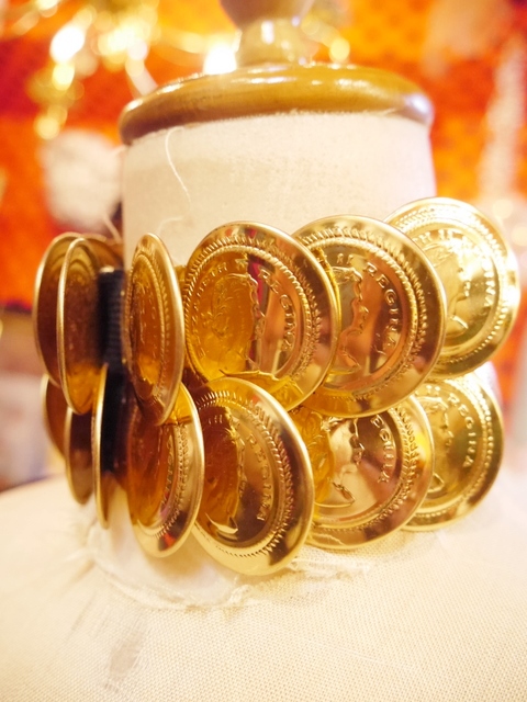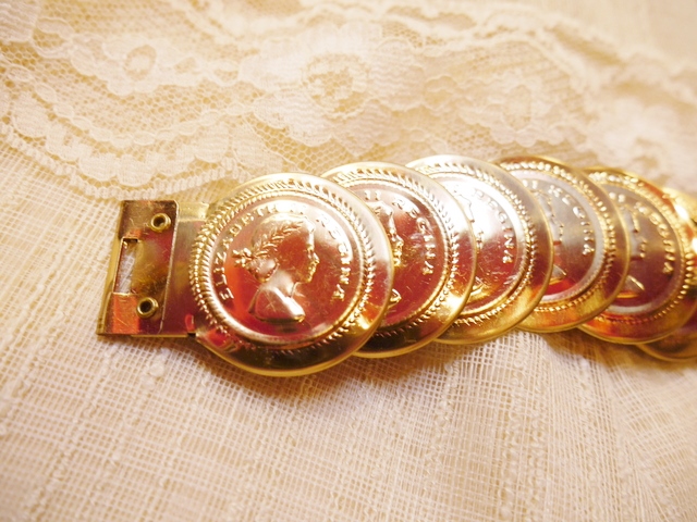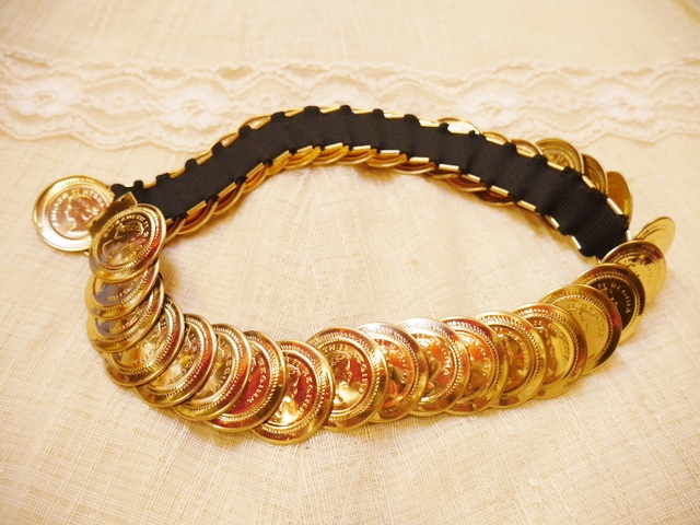 キラキラ輝くelizabeth II regina(エリザベス2世)と書かれたゴールド色のレトロコインが魅力的なヨーロピアンラバーベルト パーティーやイベント衣装におススメ!