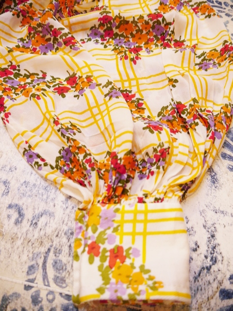 ポップな花柄×チェックコットンベースにレトロ感たっぷりのボリュームパフスリーブ×エレガンスな透け感のシフォン袖が魅力的な1960~70年代頃のイタリア製ヴィンテージワンピース 大人ガーリースタイルにプラスしたい一枚!