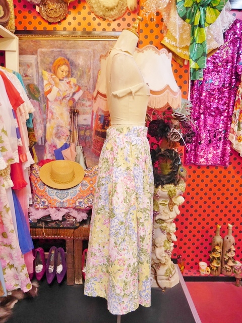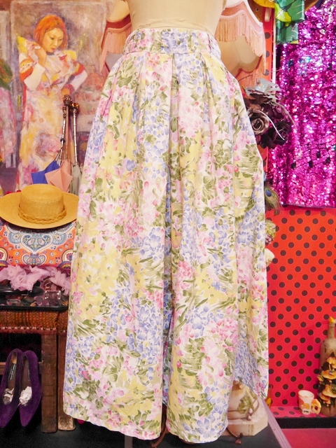 エレガントガーリーな花柄プリントにスカートのような広がりが特徴的な1980年代頃のヨーロピアンフレアパンツ ヒールを合わせればキレイめに、スニーカーと合わせればカジュアルモードに、コーディネートの幅が広がるお洒落アイテム!