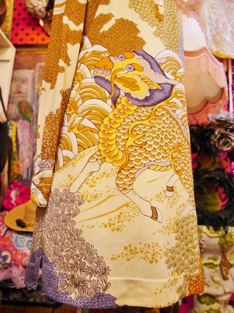 一枚で主役級アイテム!アンティーク感漂う和モダン柄に神獣の麒麟柄が目を惹くパリのアンティークショップで見つけた1960~70年代頃のフランス製ヴィンテージミニワンピース アクセントのポイントにウエストマークもおススメ!