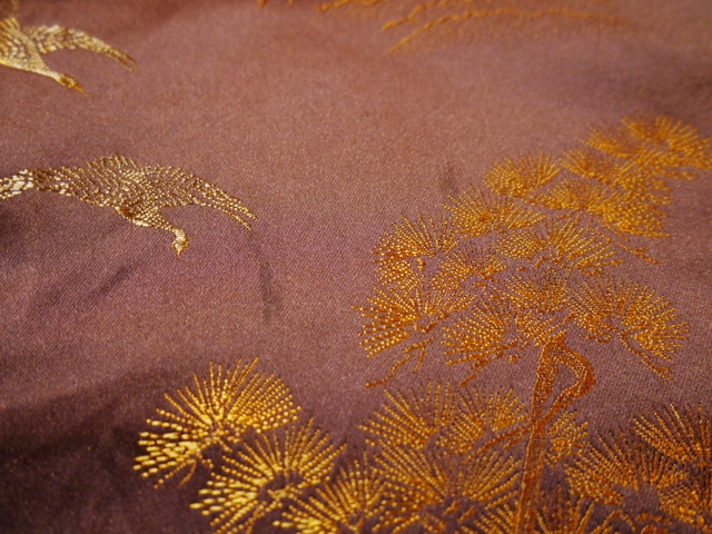 光沢感があるこげ茶色ベースに鶴や松の和柄デザインがお洒落で個性的なヨーロピアンヴィンテージオーバーサイズジャケット アクセントのポイントにウエストマークもおススメ!