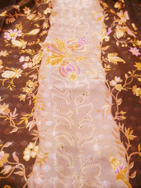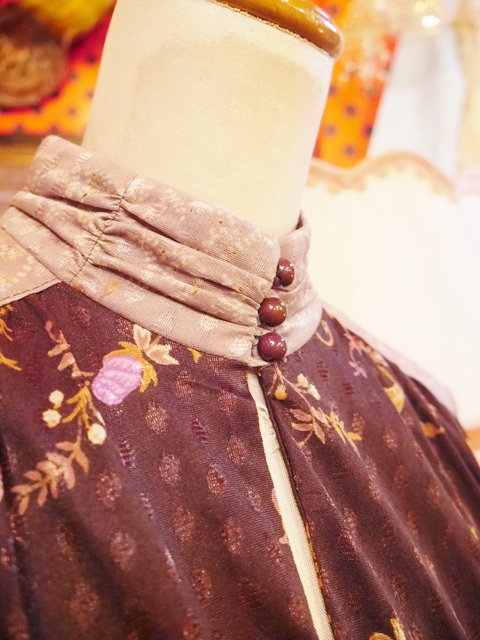 コルクとこげ茶色の切替プリントにエレガンスな花柄やリーフ模様が魅力的な1960~70年代頃のヨーロピアンヴィンテージワンピース アクセントのポイントにウエストマークもおススメ!