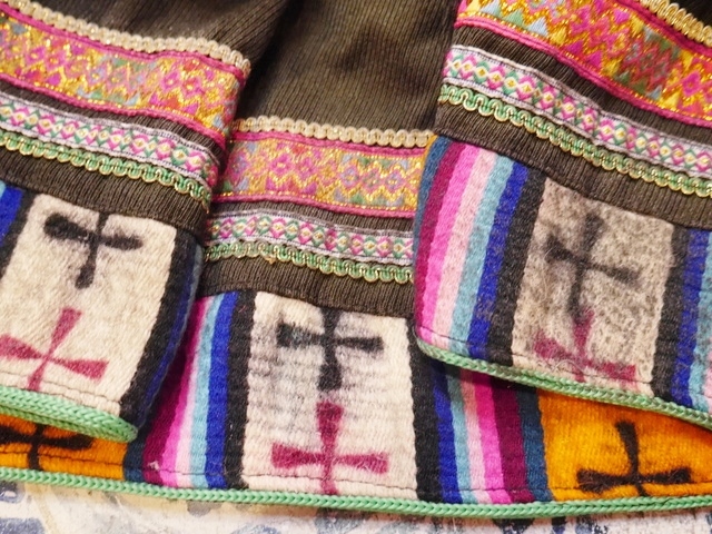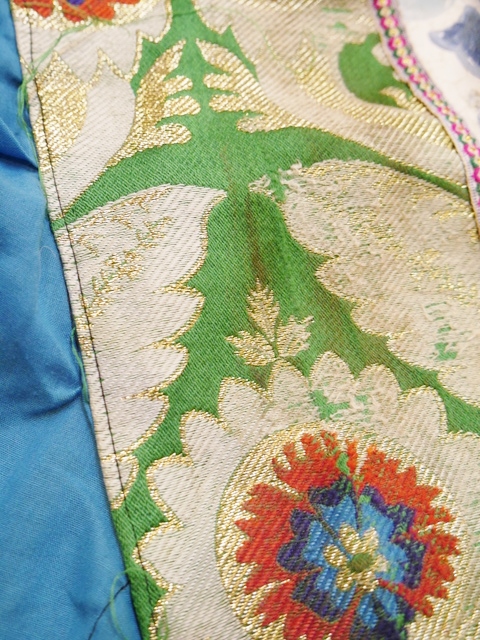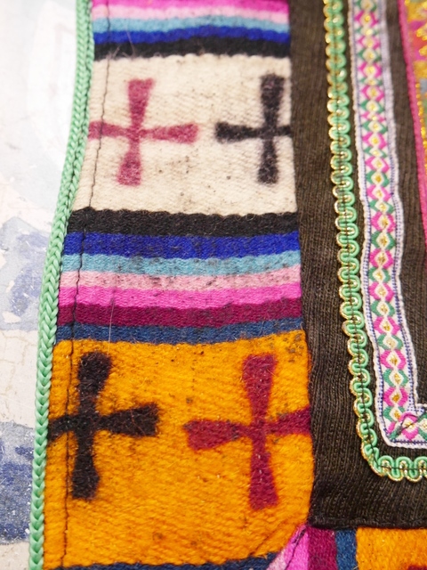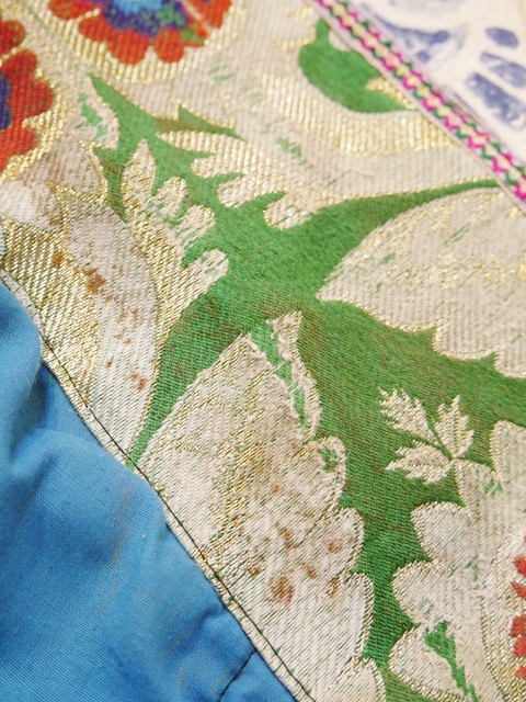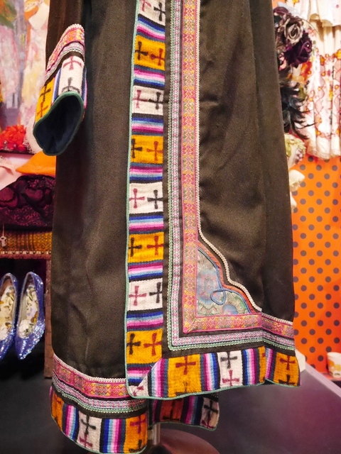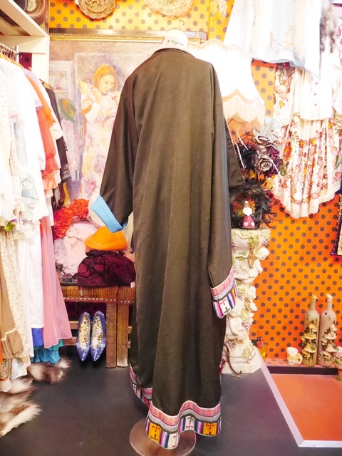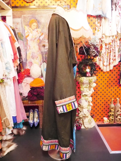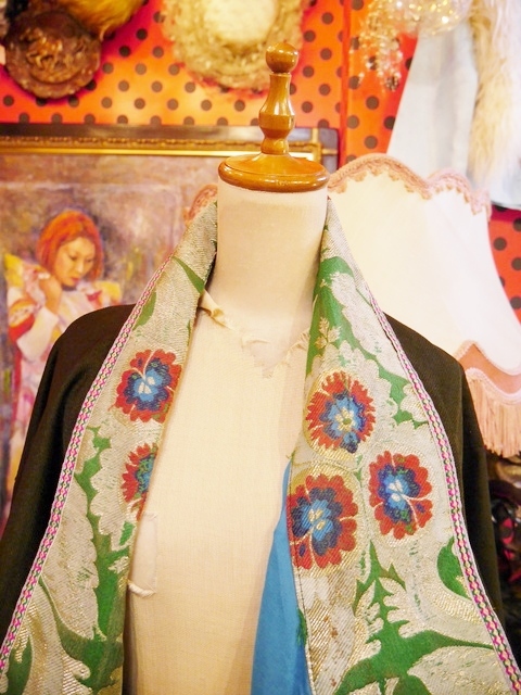 ラメ混じりの帯のようなモダン襟や裾にかけてのカラフル刺繍テープやネイティブ柄、袖丈のアシンメトリーデザインなどディテールに凝ったユニークで個性的なデザイン!パリのアンティークショップで見つけたヴィンテージ羽織コート 色鮮やかな水色裏地がお洒落ポイント!