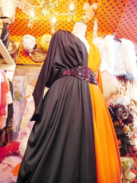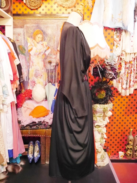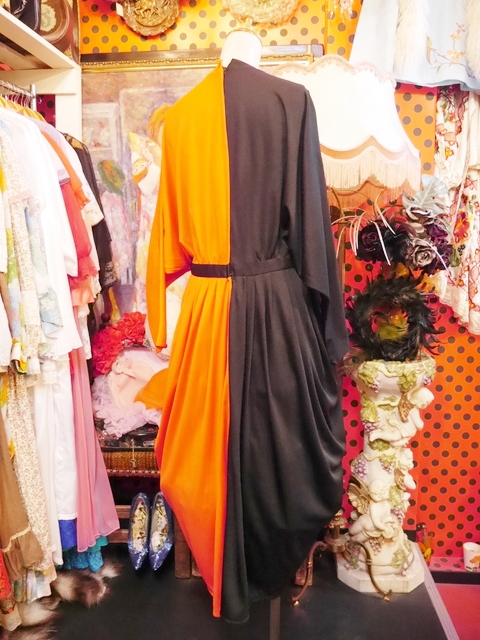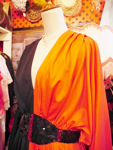 赤×黒のレトロモダンな切替にドレープ感があるドルマンスリーブやゴージャスなスパンコールビーズベルトデザインが魅力的な1970年代頃のイングランド製ヴィンテージドレス