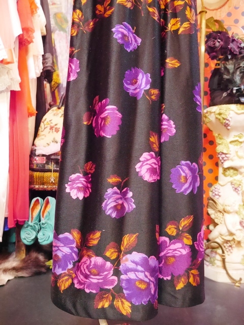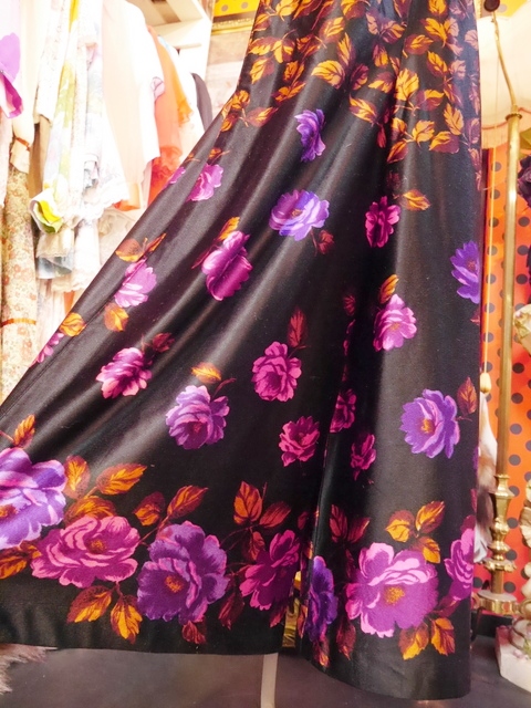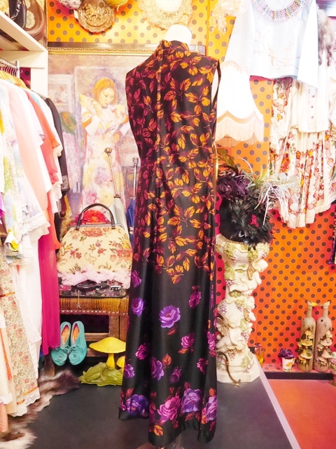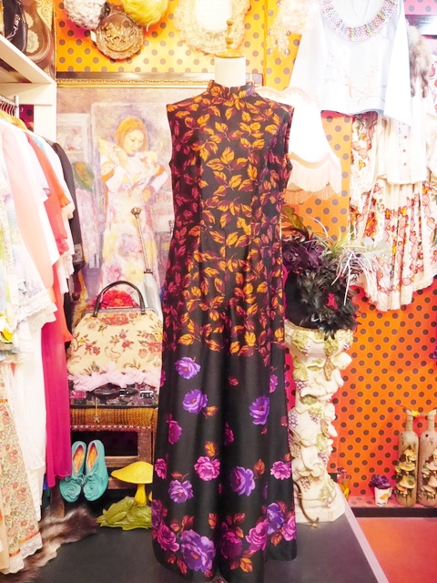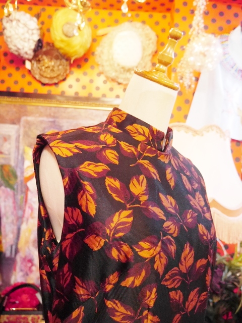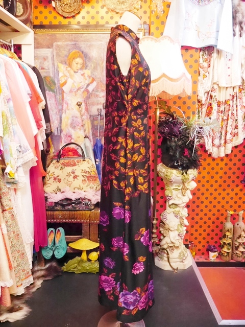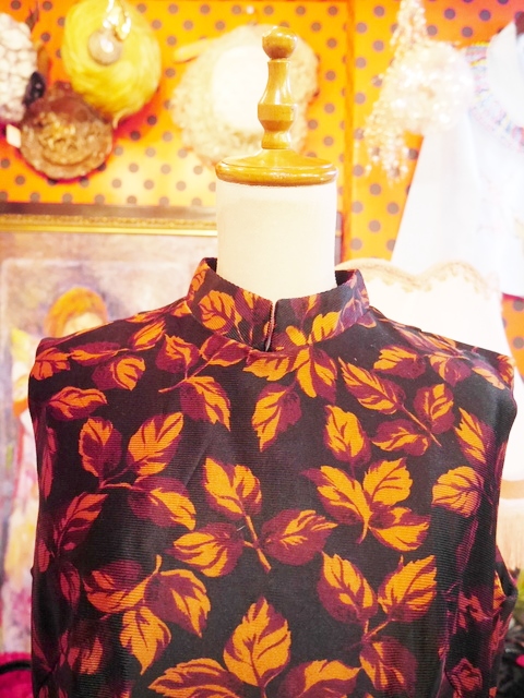 クールな印象のマオカラーにリーフ模様やモダンな花柄プリントが素敵な1970年代頃のヨーロピアンヴィンテージジャンプスーツ エレガンスなフレアデザインがお洒落ポイント!アクセントにウエストマークもおススメ!