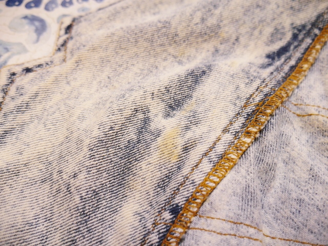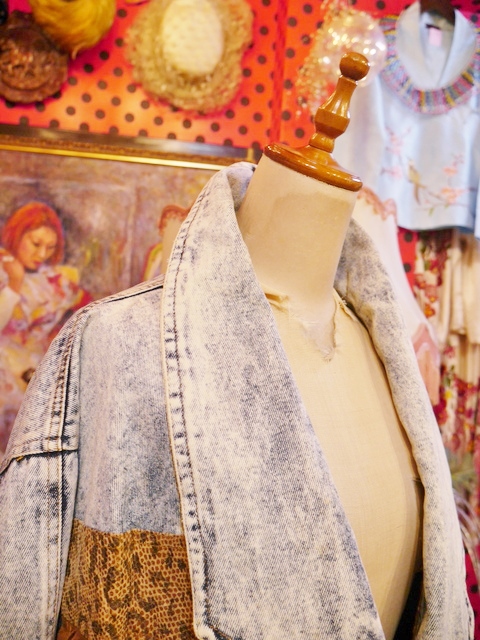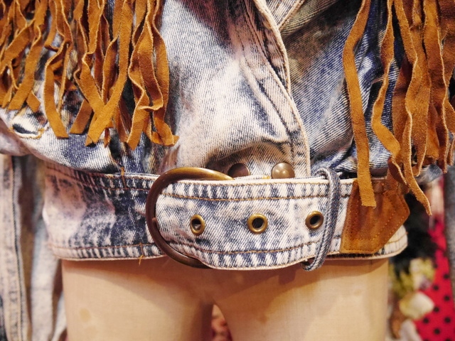 モードなドルマンスリーブにアニマル柄のパッチワークや本革フリンジデザインが個性的な1980年代頃のヴィンテージケミカルウォッシュデニムジャケット ウエストのベルトデザインやハートコンチョがお洒落ポイント!