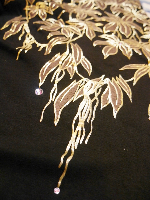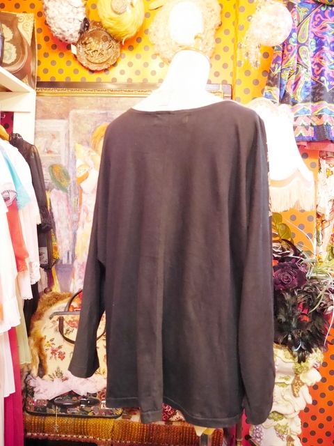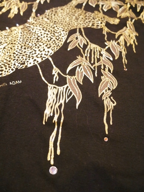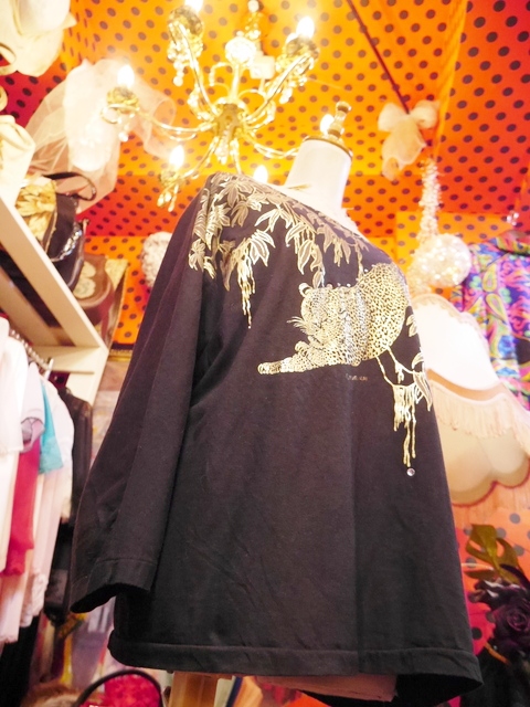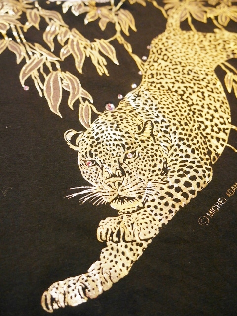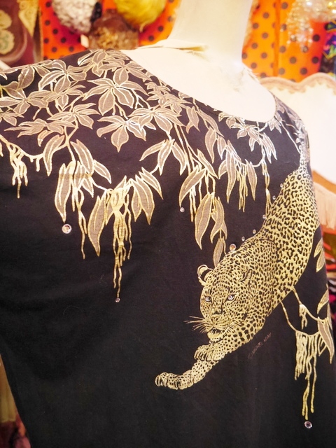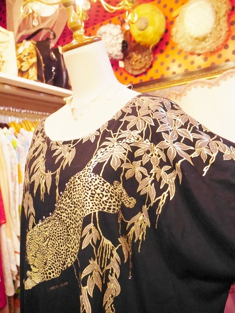 黒ベースのドルマンスリーブにインパクトたっぷりのゴールドヒョウ柄や柳のように枝垂れたリーフ模様がお洒落で個性的な1980年代頃のヨーロピアンカットソー ヒョウの目などのビジューデザインがポイント!