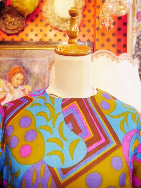 カラフルでレトロポップなペイズリー、水玉模様が可愛い1960~70年代頃のヨーロピアンヴィンテージワンピース アクセントにウエストマークもおススメ!