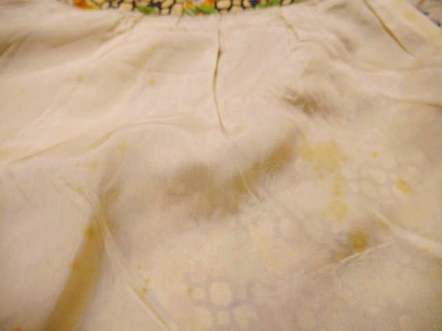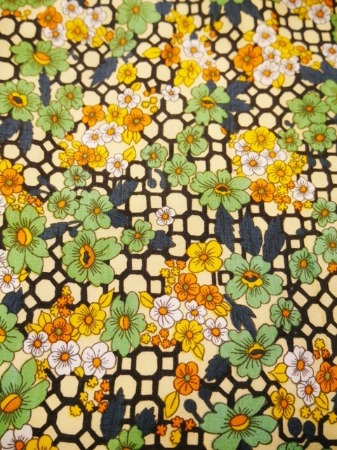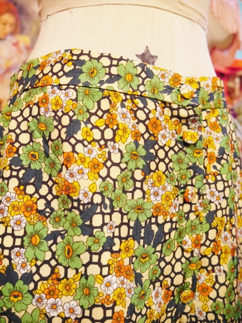 ベージュベースに編み目模様やレトロポップな花柄プリントが可愛らしい1960~70年頃のヨーロピアンヴィンテージスカート 同生地のくるみボタンがお洒落ポイント!