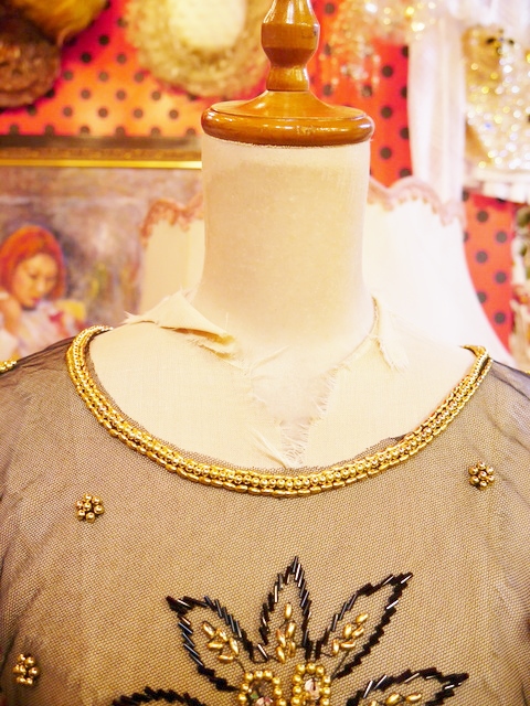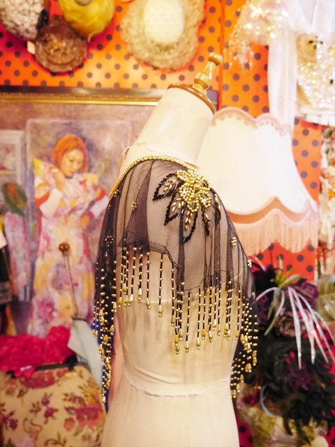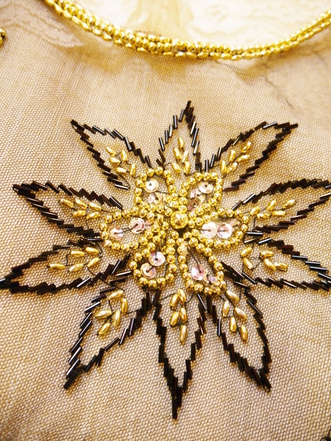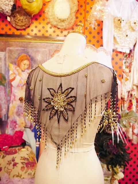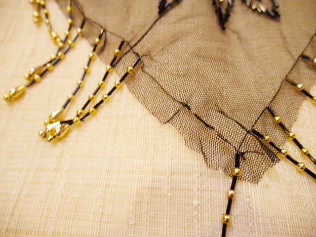 透け感がある黒ベースにゴールドビーズやスパンコールのお花模様×ゆらゆら揺れるフリンジデザインがお洒落なヨーロピアンパーティーポンチョショール シンプルクローズのアクセントにおススメ!
