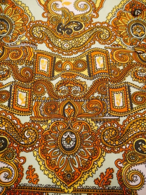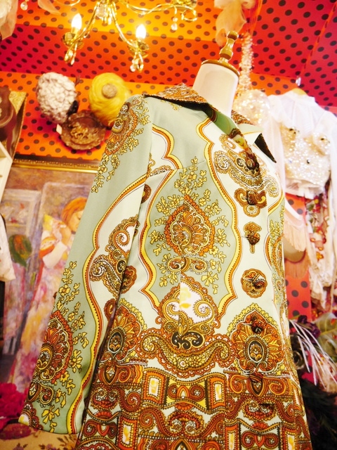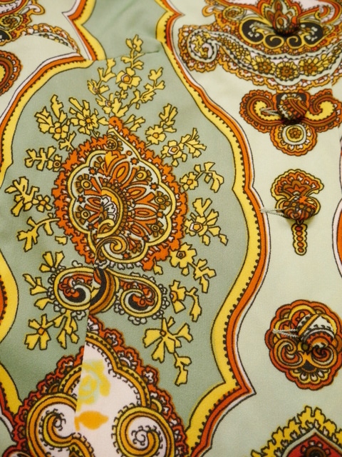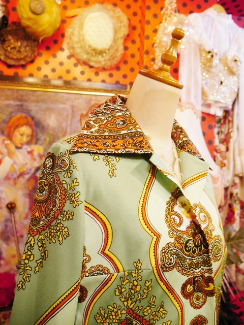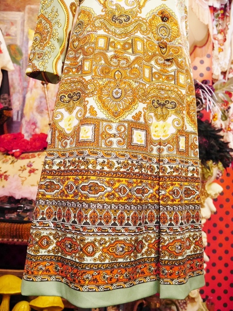 グラスグリーン×リーフグリーンのレトロな色合いにエレガンスなサイケデリックプリントが魅力的な1960~70年代頃のヨーロピアンヴィンテージワンピース アクセントにウエストマークもおススメ!