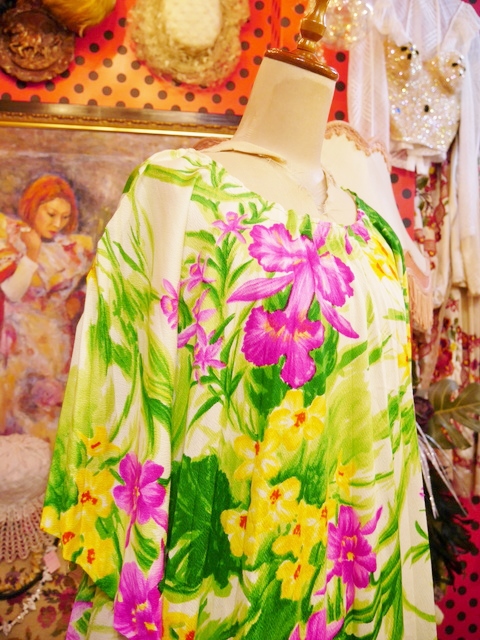 目を惹くカラフルなボタニカル柄にドレープ感があるエレガンスなプリーツデザインが魅力的な1970年代頃のヨーロピアンヴィンテージポンチョワンピース フェスやイベント衣装におススメ! ★SALE★