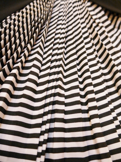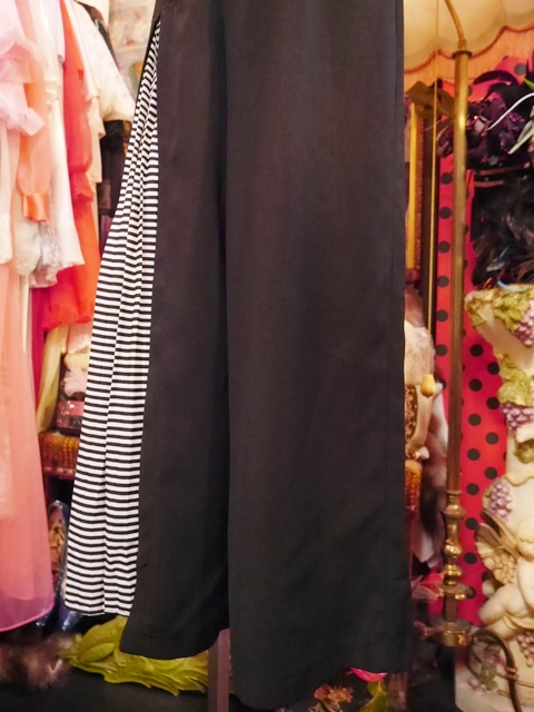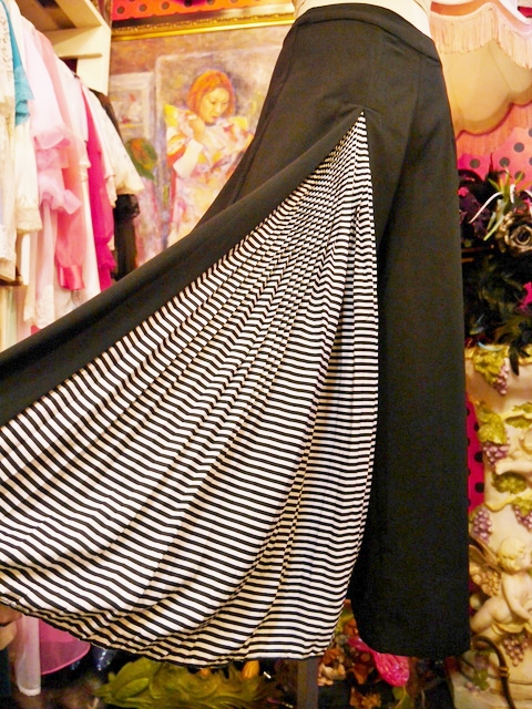 アシンメトリーな白黒ボーダーのプリーツデザインが目を惹くヨーロピアンフレアパンツ モノトーンコーデにプラスしたいお洒落アイテム!