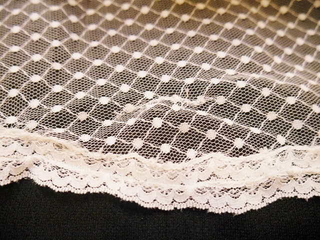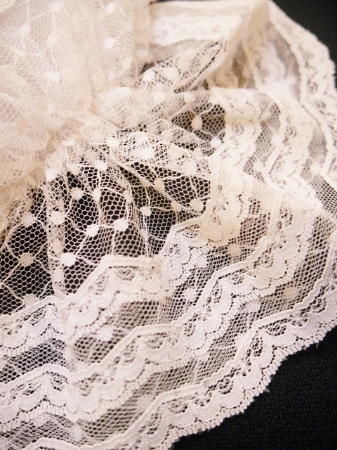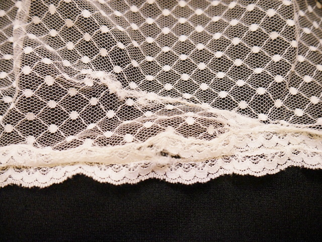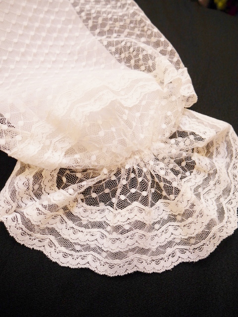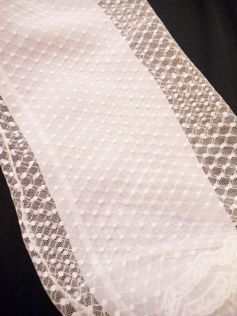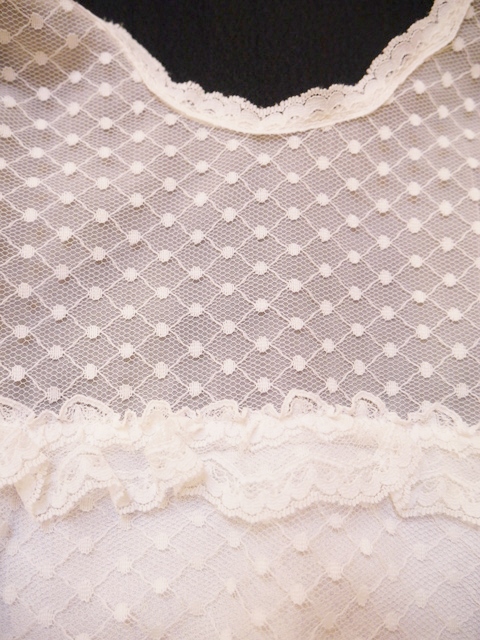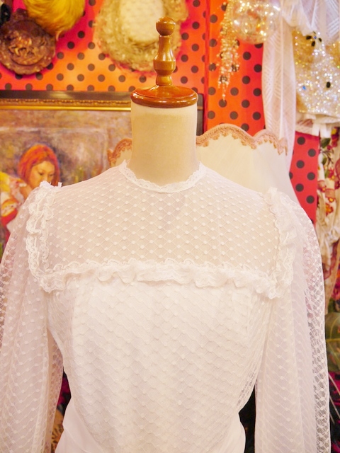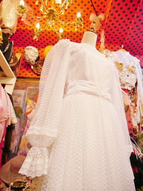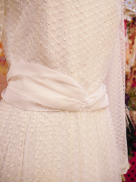 チュールと水玉レースの優しい透け感に繊細かつ華やかなレースフリルデザインが魅力的な1970年代頃のヨーロピアンヴィンテージウエディングドレス 大きなバックリボンがお洒落ポイント!ガーデンウェディングや2次会、イベント衣装におススメ!