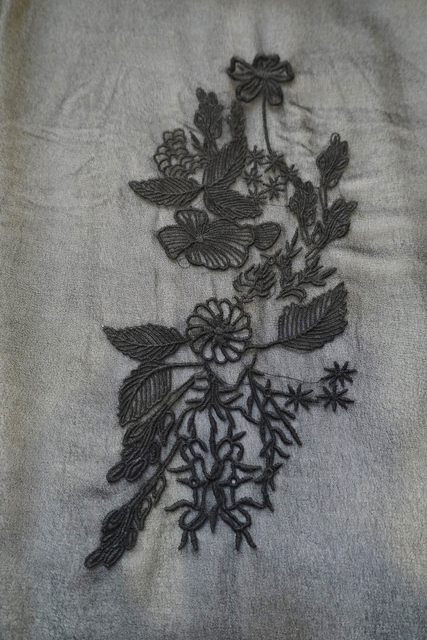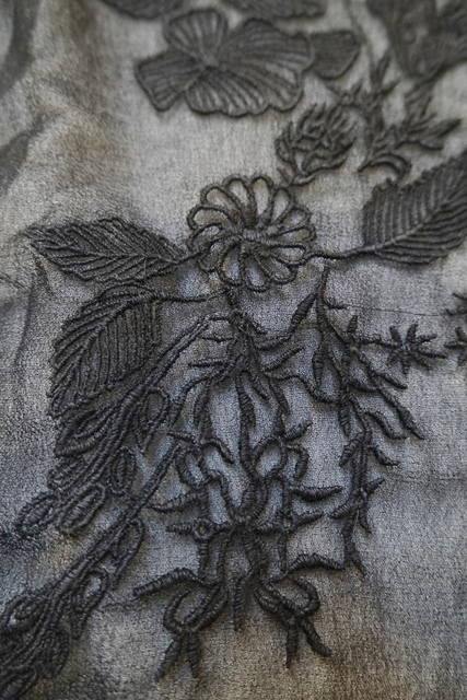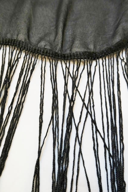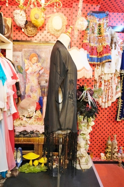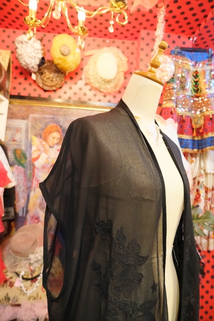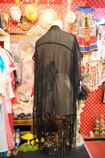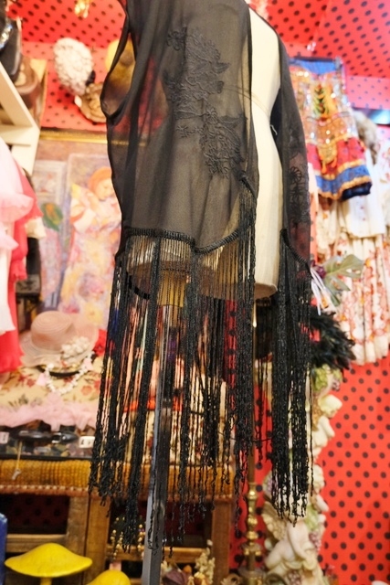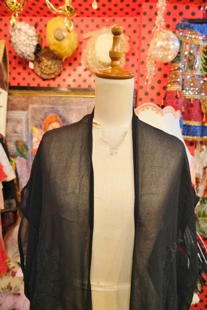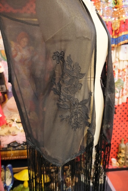 ヨーロッパ古着ロングフリンジ花柄刺繍黒シフォン羽織