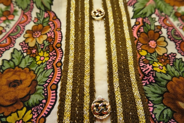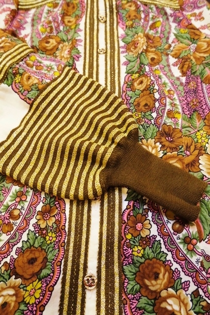 レトロでエレガントな花柄プリントにこげ茶色×ゴールドのリブ切替デザインがお洒落で個性的な1960年代頃のヨーロピアンヴィンテージカーディガン ちょうちん袖が強調されるロングリブカフスがポイント!