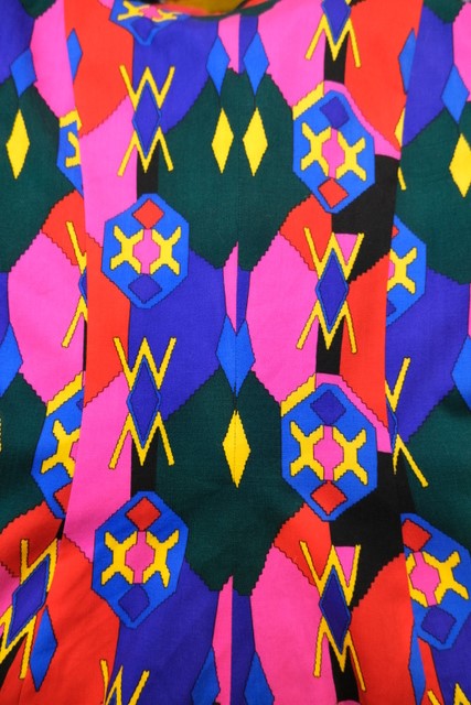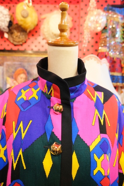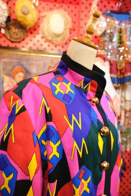 目を惹くサイケデリックでカラフルなパッチワークプリントにクールな印象のスタンドカラー×ゴージャスなゴールドボタンが魅力的な1970~80年代頃のドイツ製ヴィンテージジャケット アクセントにウエストマークもおススメ!