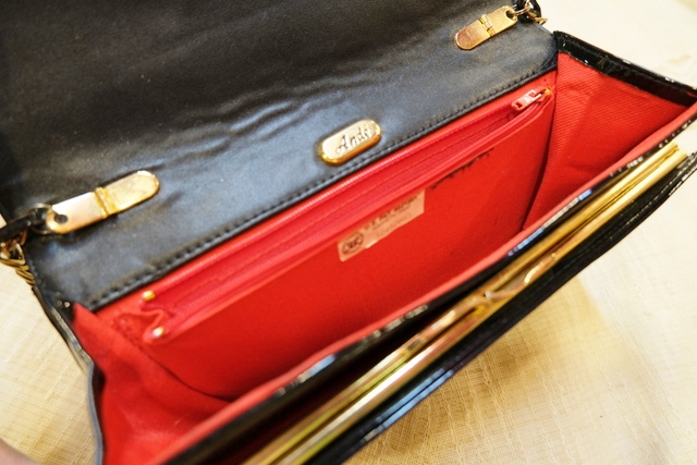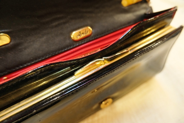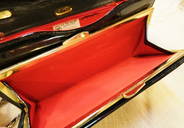 艶やかな黒エナメルに赤い裏地×お財布デザインがカッコ可愛いヨーロピアンヴィンテージチェーンバッグ コーデに華やかさをプラスしてくれるお洒落バッグ