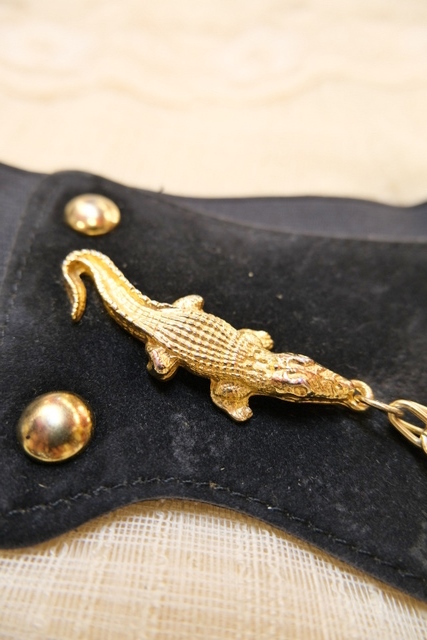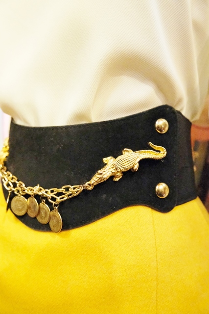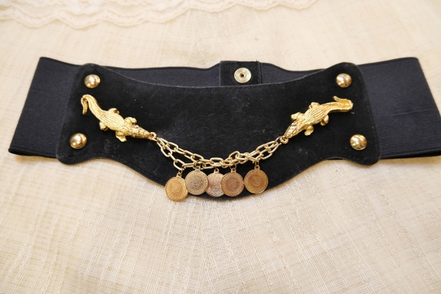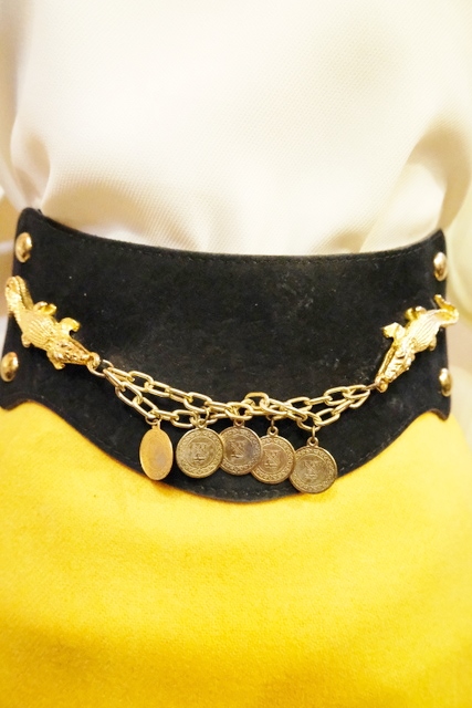 リアルで個性的なゴールド色のワニにチェーン×コインデザインが魅力的なフランス製ヴィンテージパーティーベルト ワンピース、スカート、ブラウス、ジャケットなどのアクセントのポイントにおススメ!
