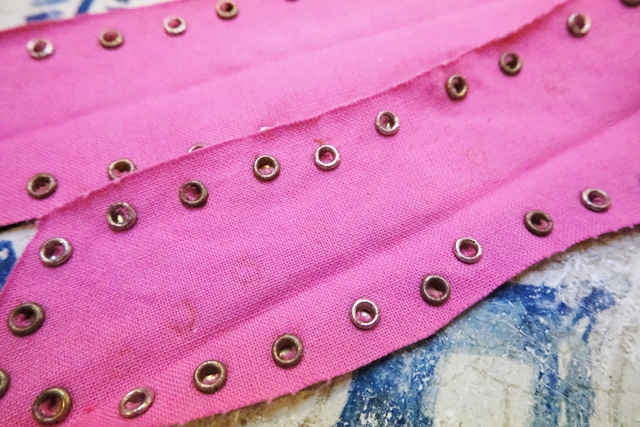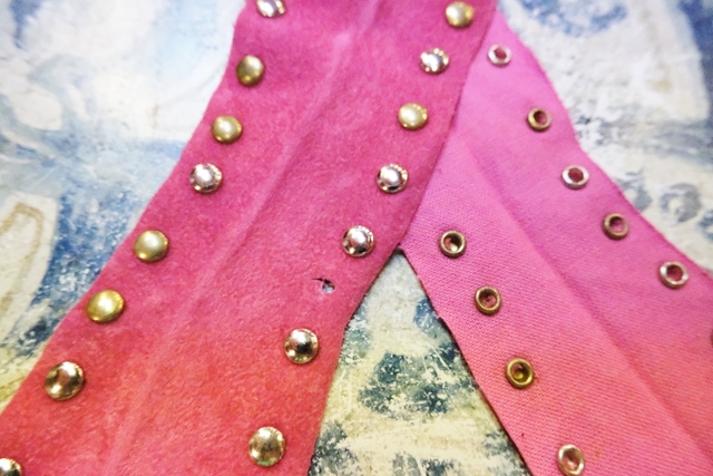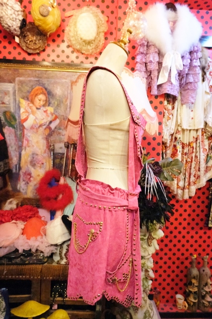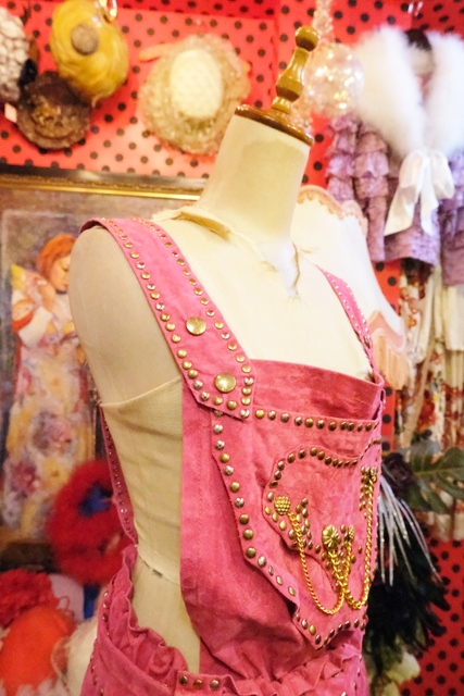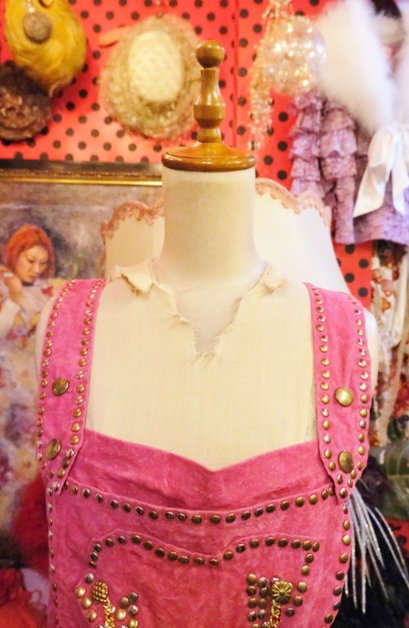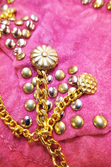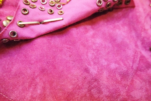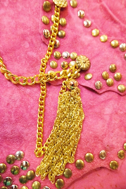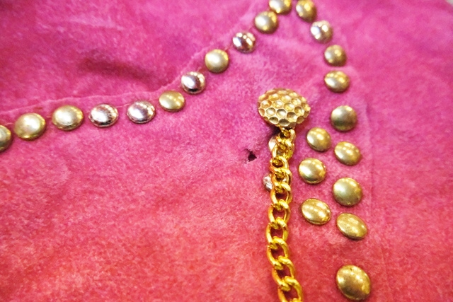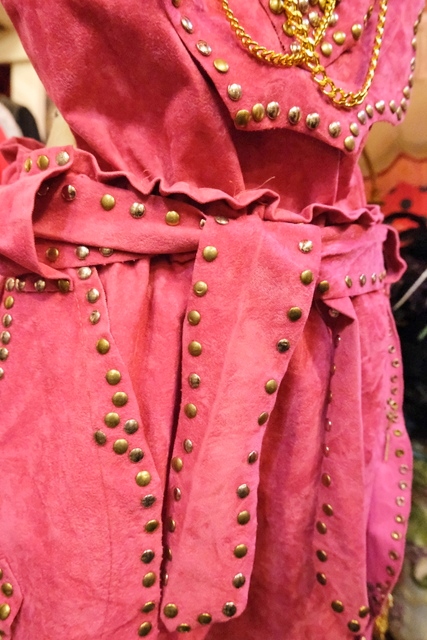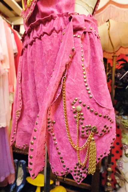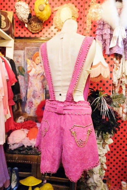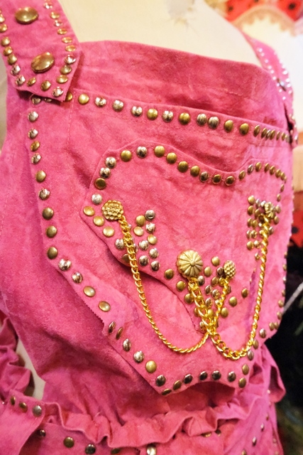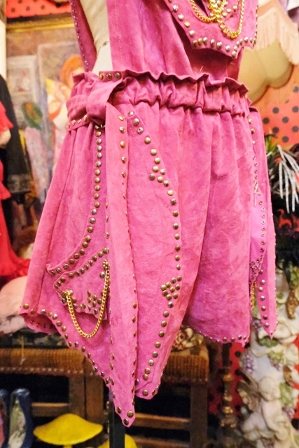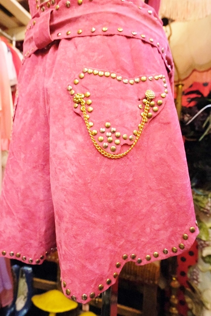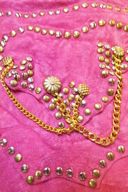 スエード風のレトロポップなピンクベースにファンキーなスタッズやチェーン、ゴールドコンチョがお洒落で個性的なオランダ製ヴィンテージサロペット