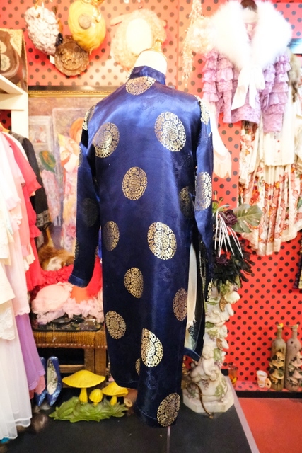 光沢があるネイビーベースにゴールドのチャイナ柄や龍、着丈が長く両サイドの長いスリットデザインが魅力的なチャイナロングカットソー