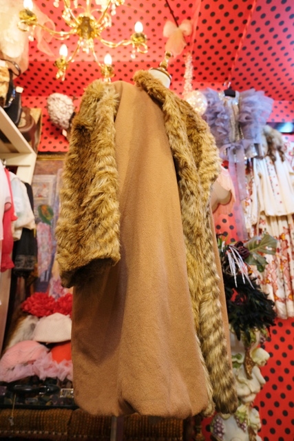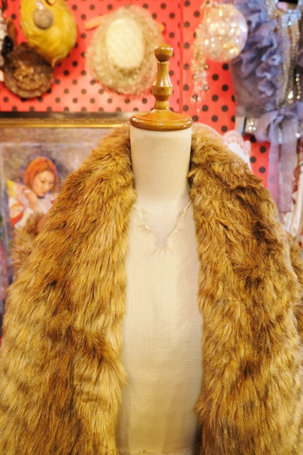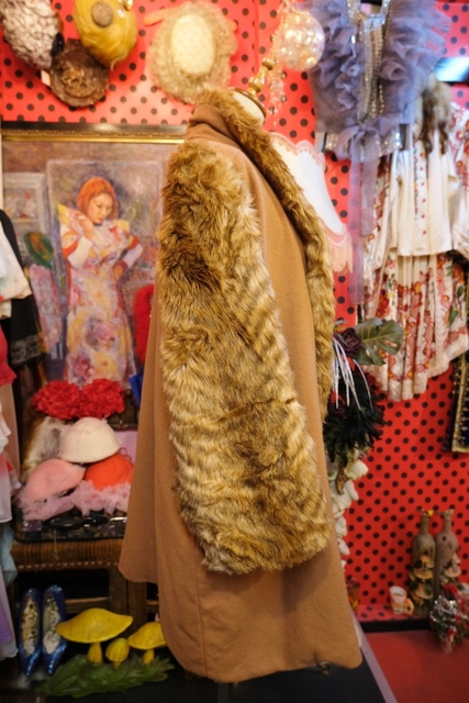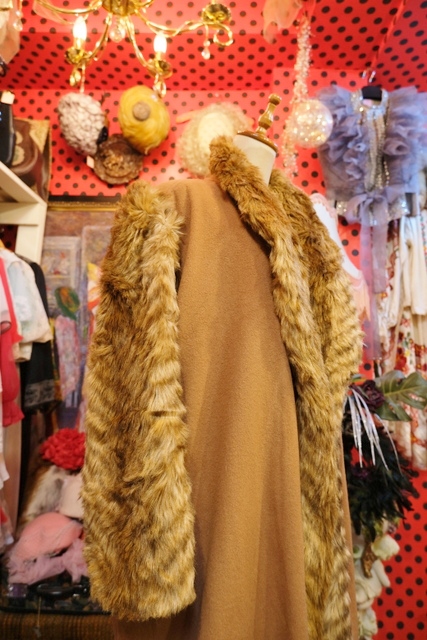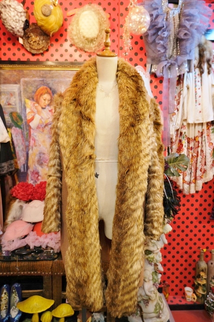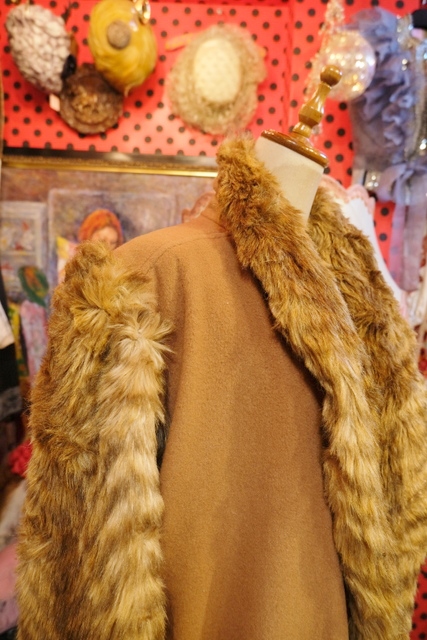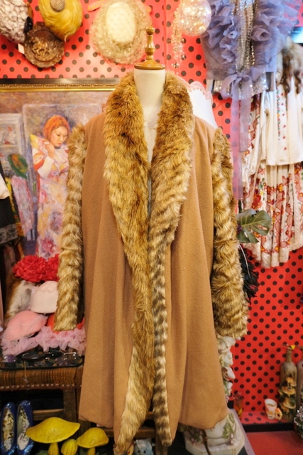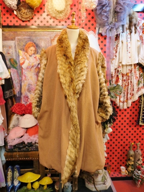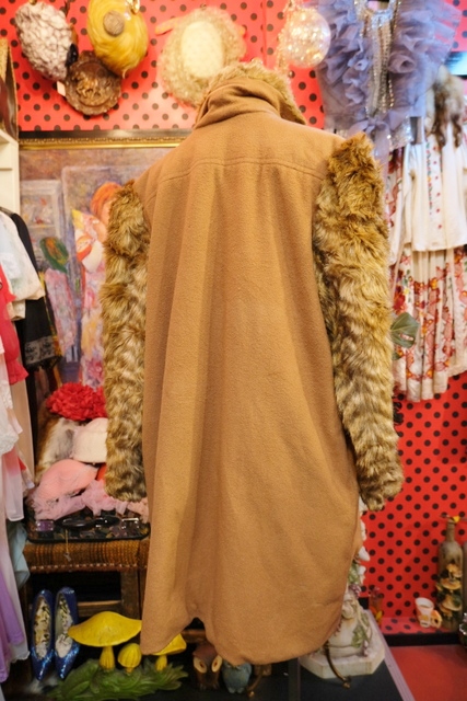 ボリューミーなフェイクファーの袖や襟、ボタンなしの羽織デザインがお洒落で個性的なヨーロピアンヴィンテージコート アクセントにウエストマークもおススメ!★SALE★