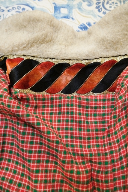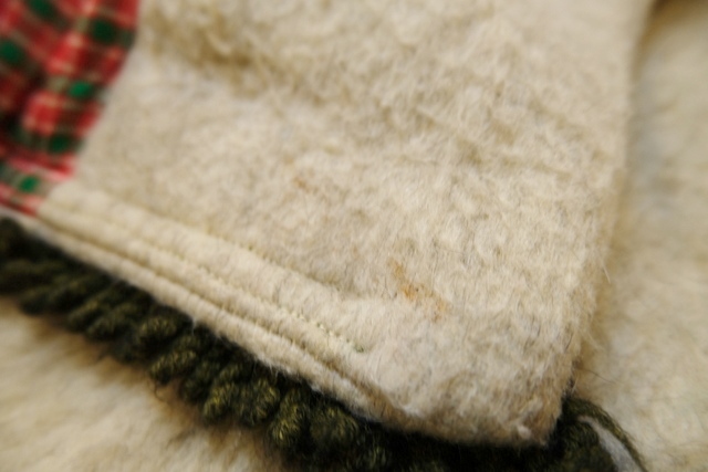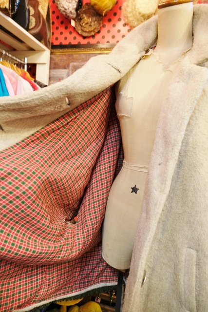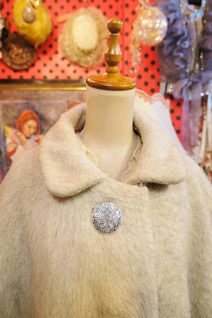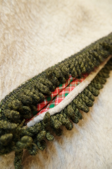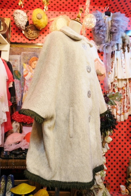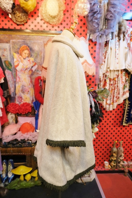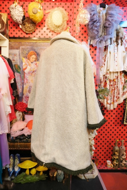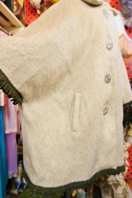 クリームグレイベースにグリーンのフリンジテープや大きなアンティークコインボタンが魅力的なヨーロピアンヴィンテージチロルマント チェックの裏地がお洒落ポイント!★SALE★