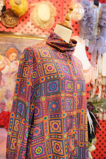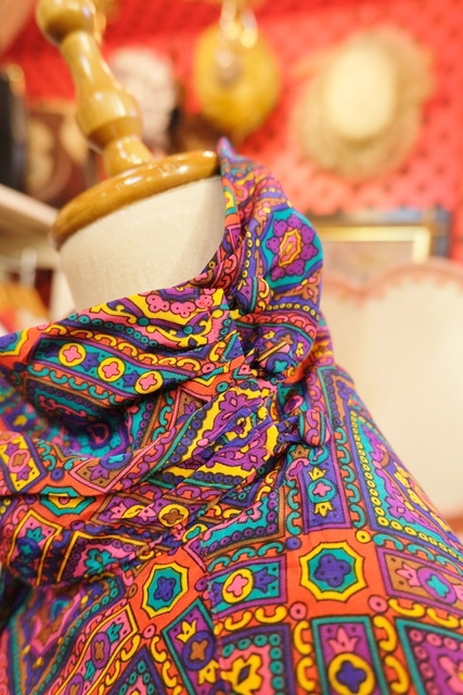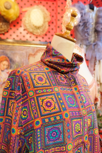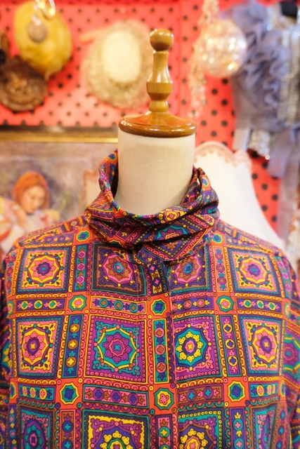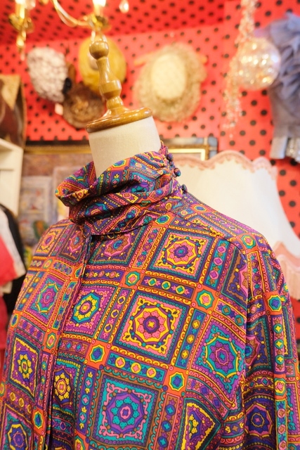レトロサイケデリックな総柄にドレープ感があるタートルデザインが魅力的な1980年代頃のヨーロピアンヴィンテージブラウス
