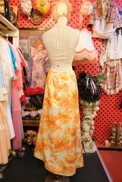 光沢感がある淡いオレンジベースにレトロモダンなもみじや梅柄がアンティーク感漂う1960~70年代頃のヨーロピアンヴィンテージロングスカート