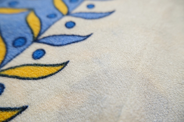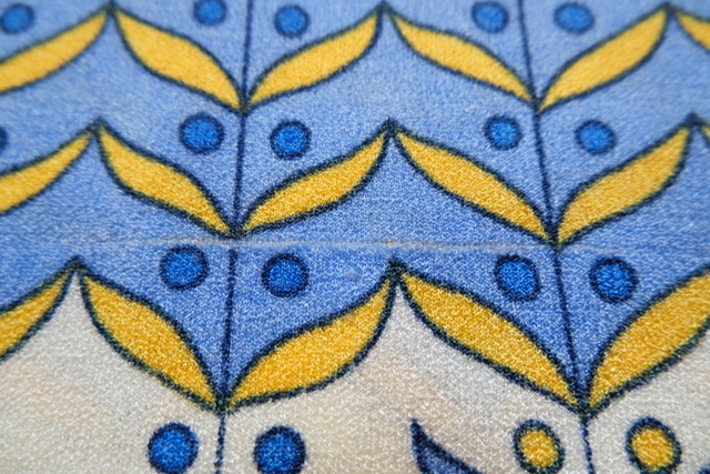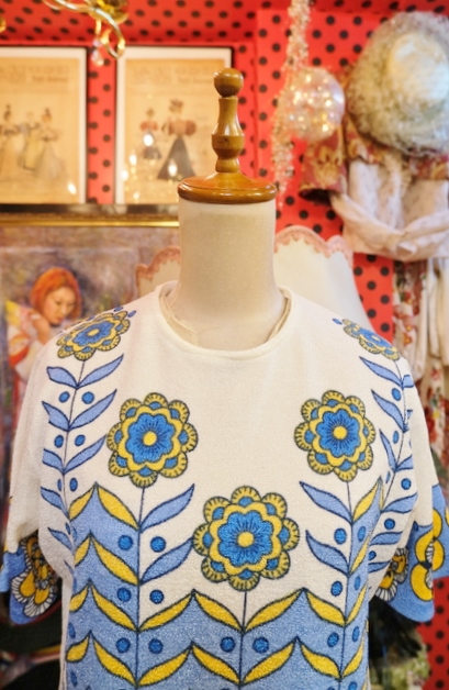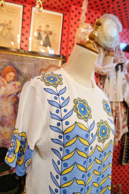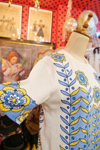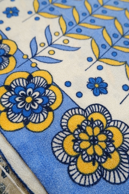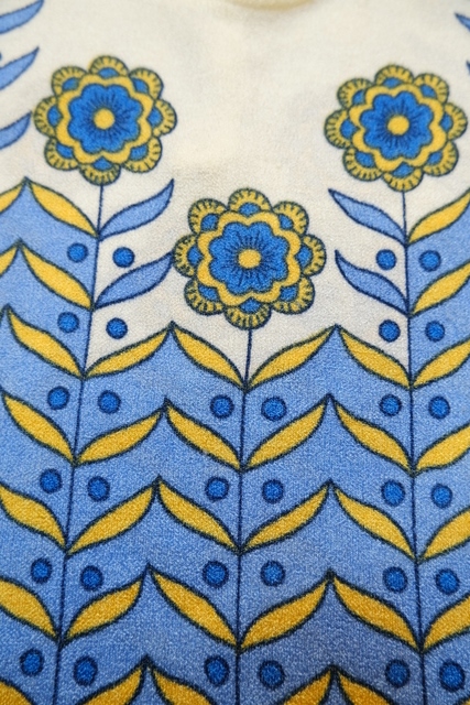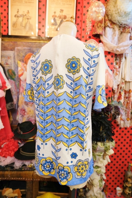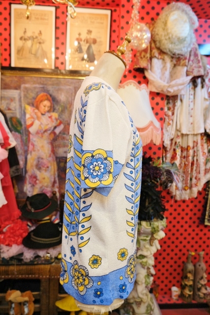 水色と黄色のレトロポップな花柄模様が可愛らしい1970年代頃のヨーロピアン半袖カットソー ブラウスと合わせてもお洒落なアイテム!