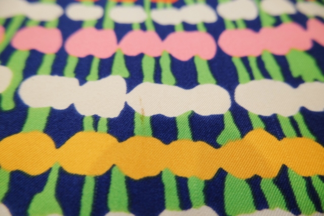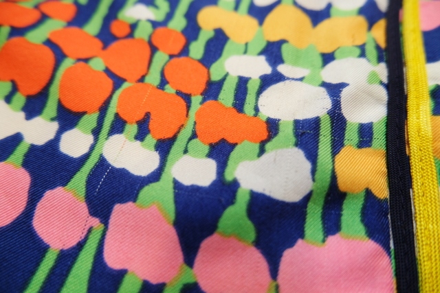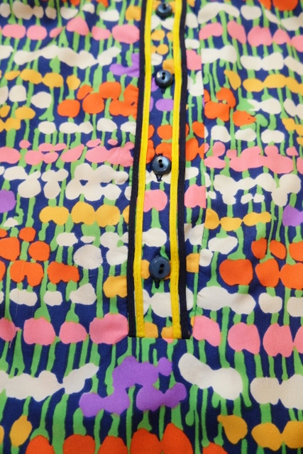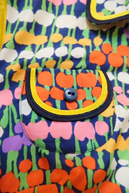 ネイビーベースに花柄のようなカラフルポップ模様×丸いレトロポケットが可愛らしい1960~70年代頃のヨーロピアンヴィンテージノースリーブワンピース アクセントにウエストマークもおススメ!