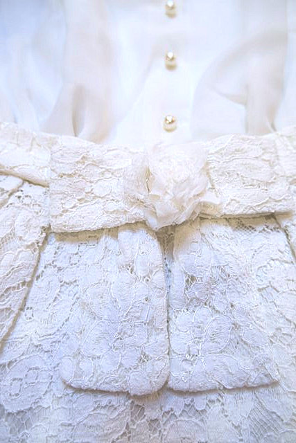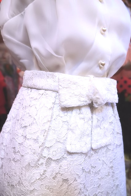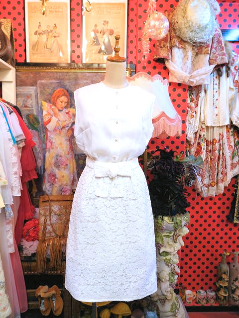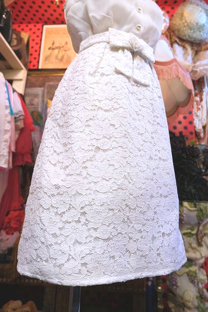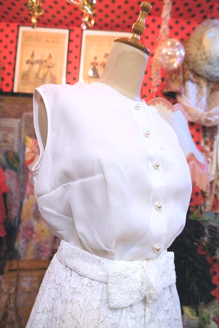 ふんわり軽やかなシフォントップスにエレガントな花柄レース×リボンデザインが魅力的な1960~70年代頃のヨーロピアンヴィンテージワンピース パールボタンがお洒落ポイント!