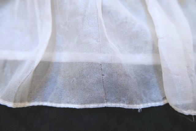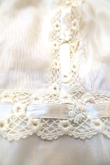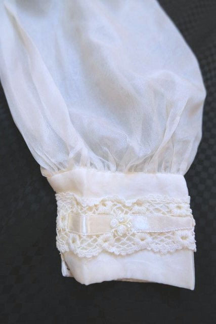 首回りやウエストのロマンティックなレースデザインにエレガントなシフォン袖の透け感が魅力的な1970年代頃のヨーロピアンヴィンテージワンピース