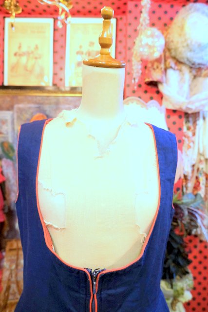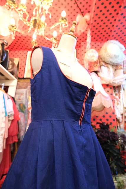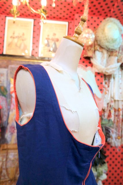 ドイツ南部からオーストリアチロル地方にかけての民族衣装ディアンドル ネイビーベースに赤いパイピング×カラフルな花柄刺繍、ふんわり広がるミニ丈が可愛らしいヨーロピアンヴィンテージチロルワンピース
