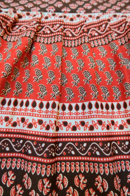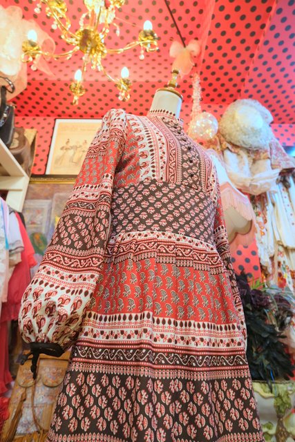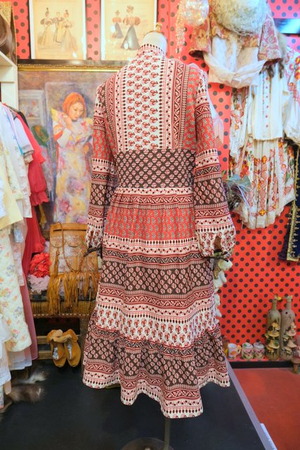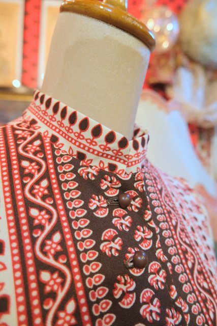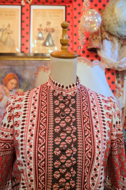 アンティーク感漂うエスニック模様にエレガントな印象のスタンドカラー×裾のフリルデザインが可愛らしい1970年代頃のヨーロピアンヴィンテージワンピース