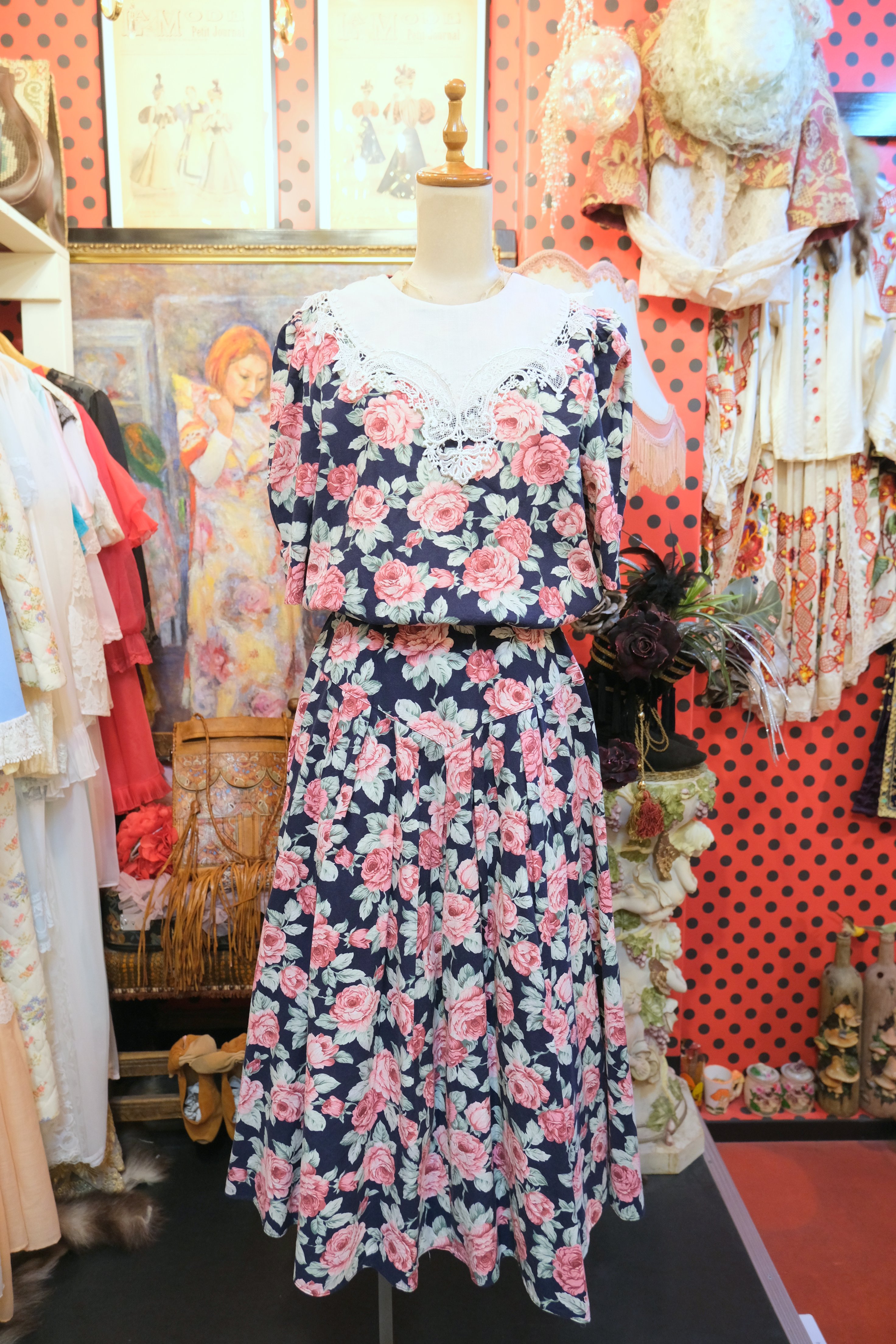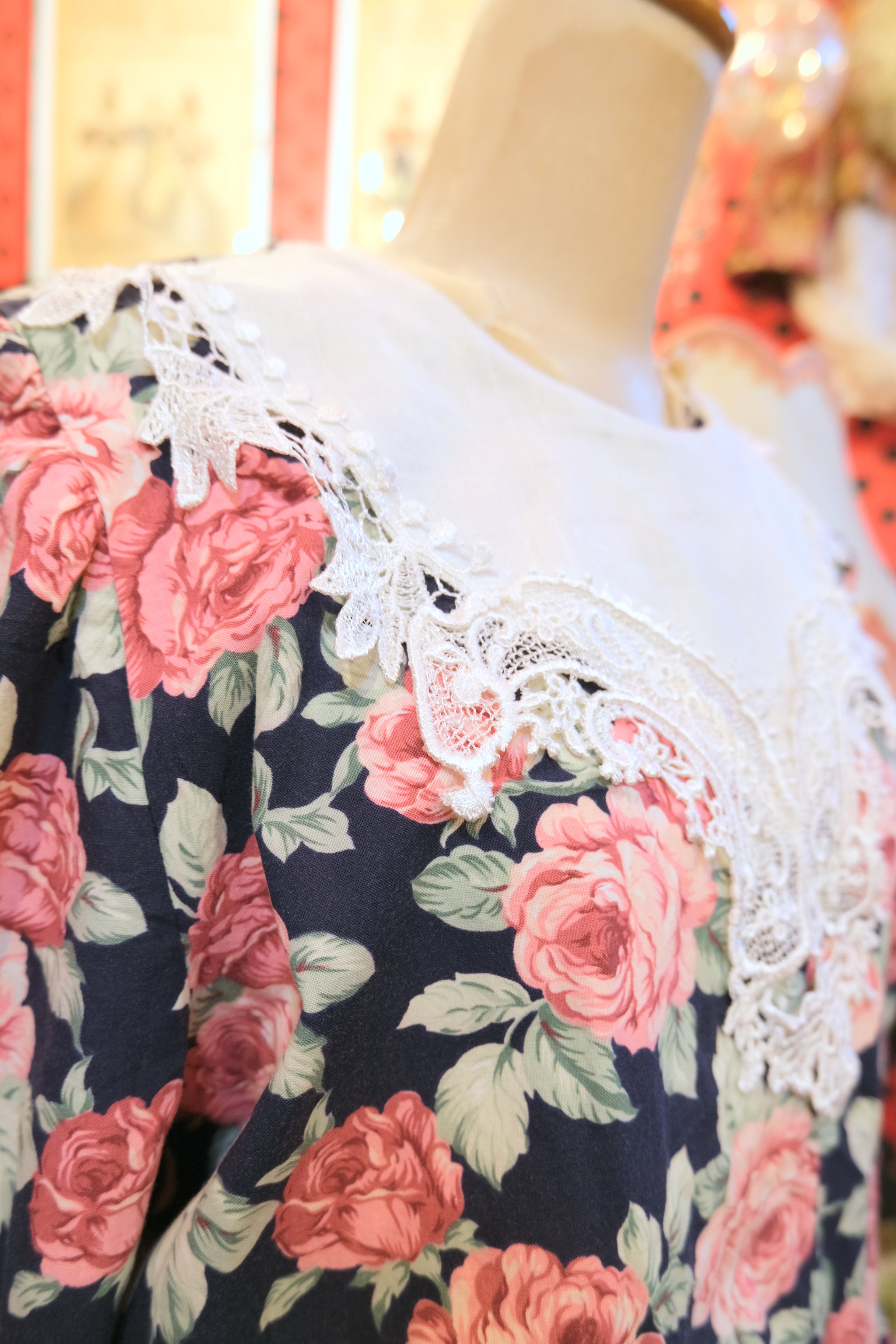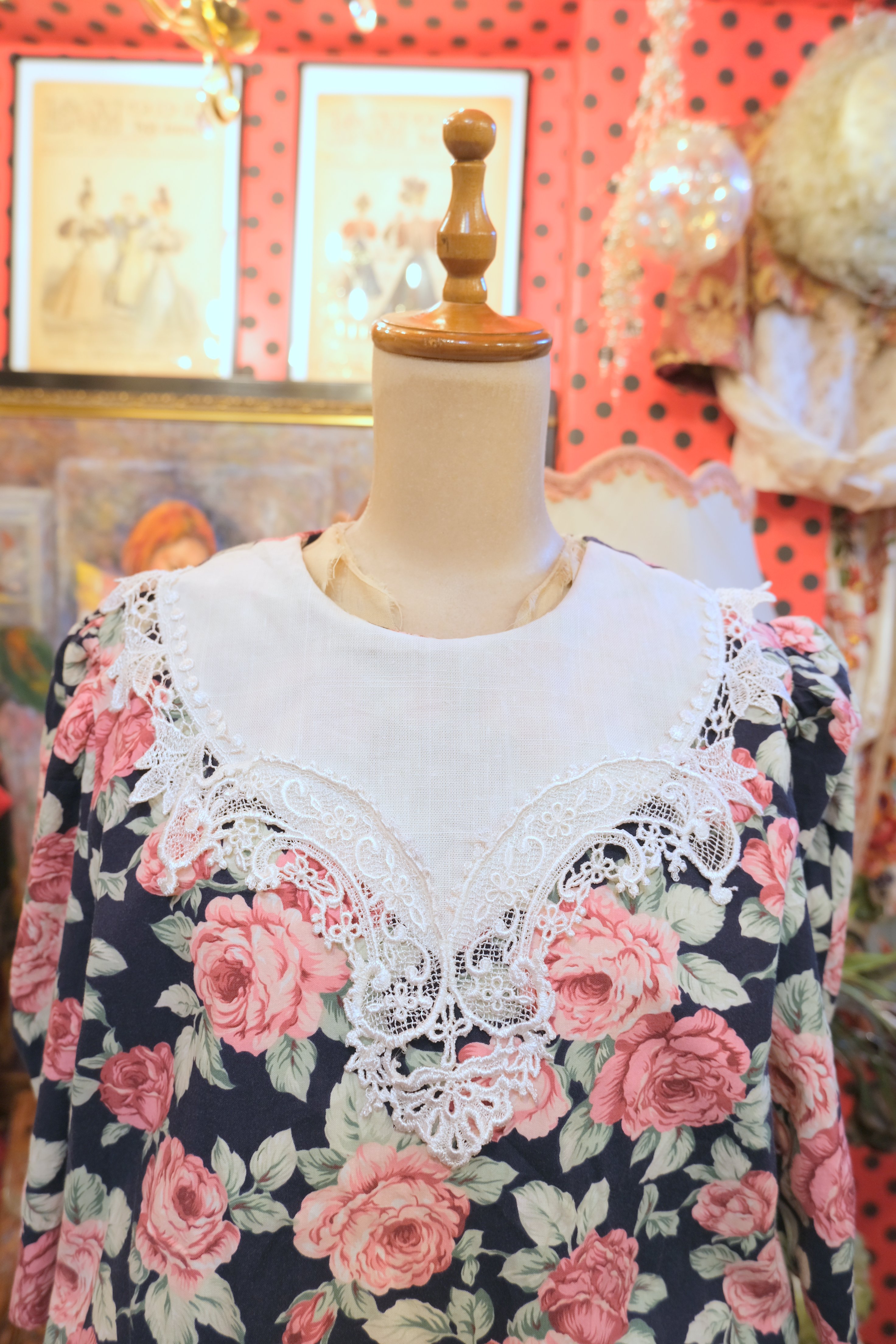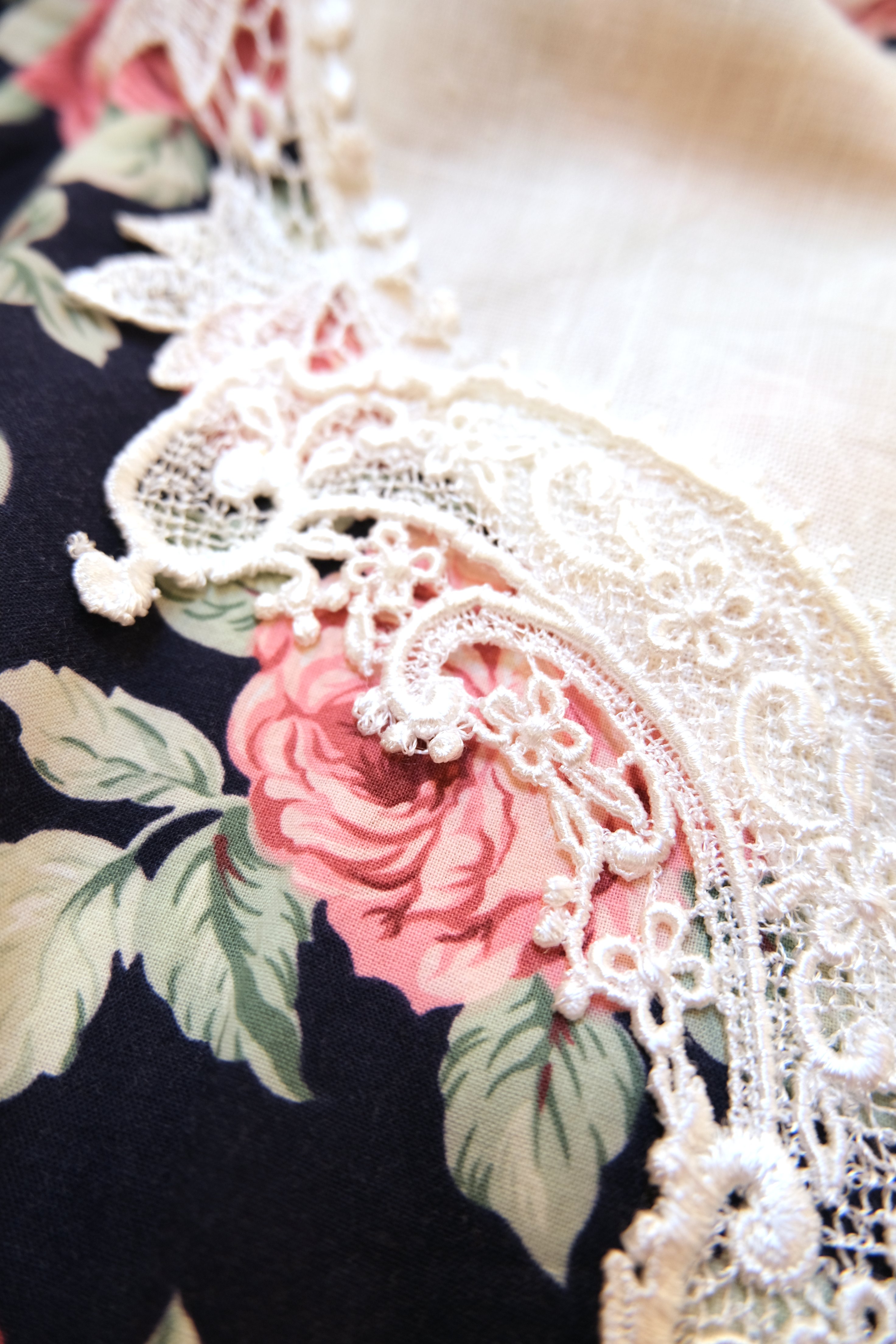 ネイビーベースに華やかな総花柄プリント×エレガントなレースデザインが魅力的な1980年代頃のUSA製ヴィンテージワンピース