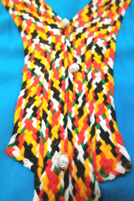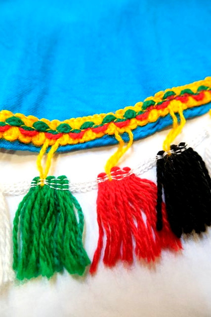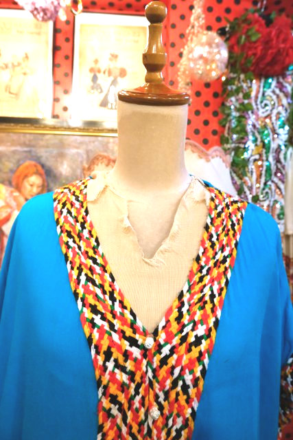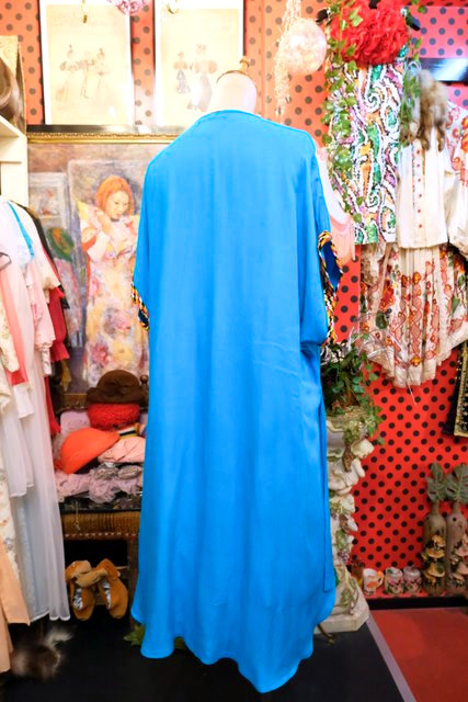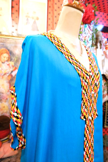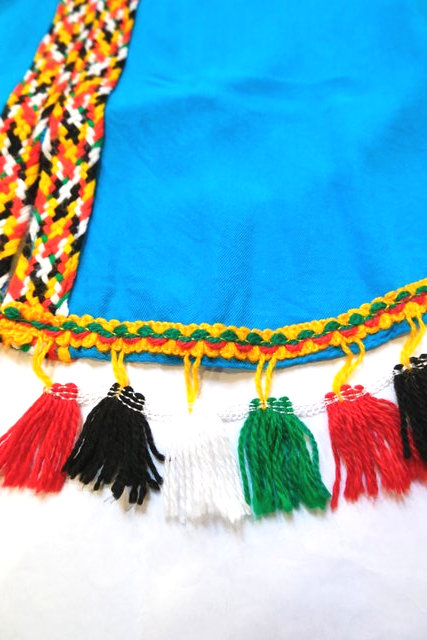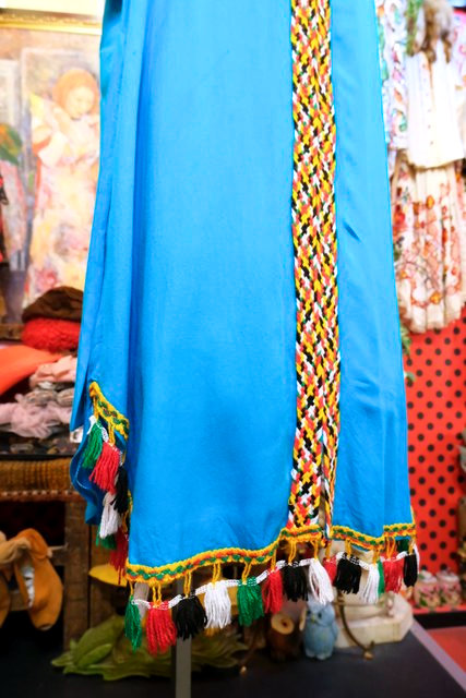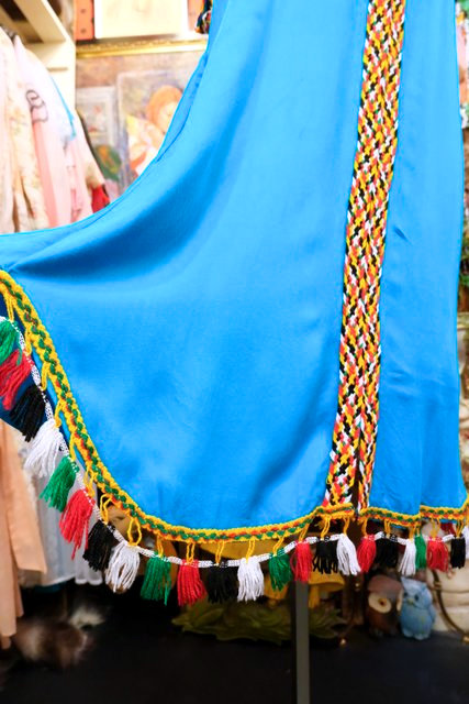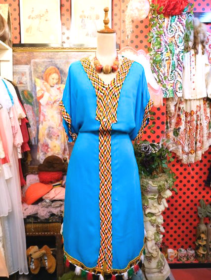 色鮮やかなターコイズブルーベースにカラフルな毛糸編込みデザインや裾のカラフルポップなフリンジが可愛らしいヨーロピアンエスニックワンピース ★SALE★