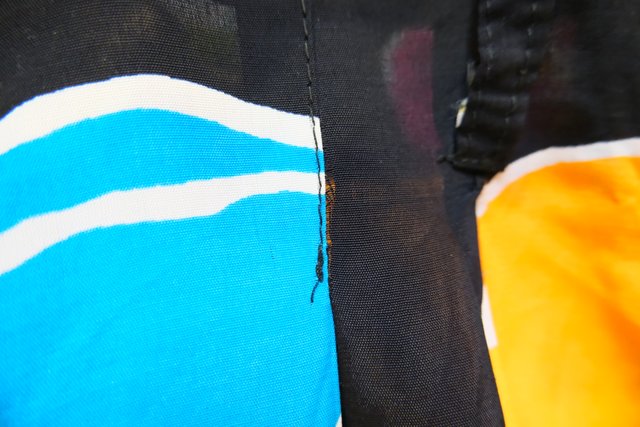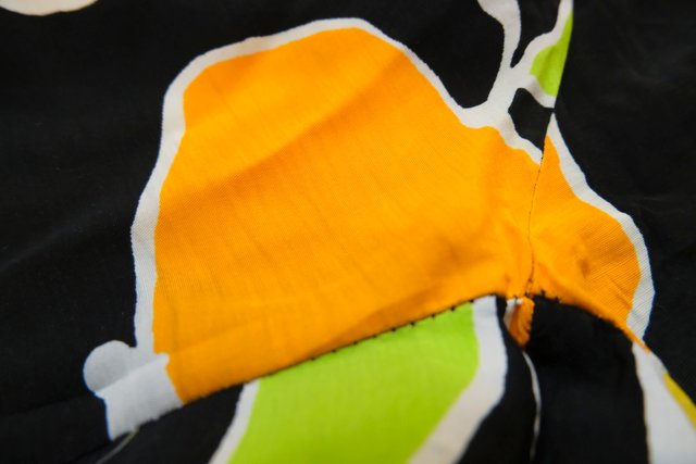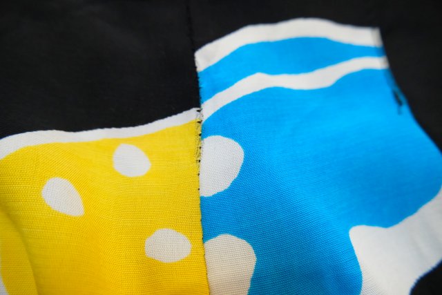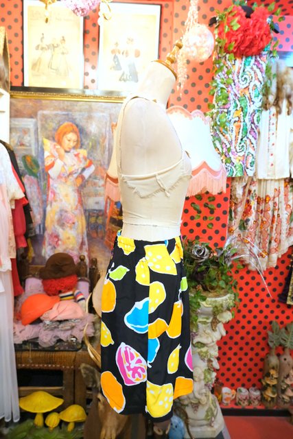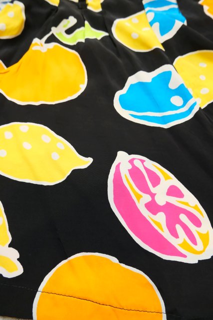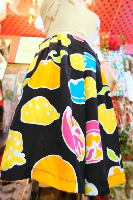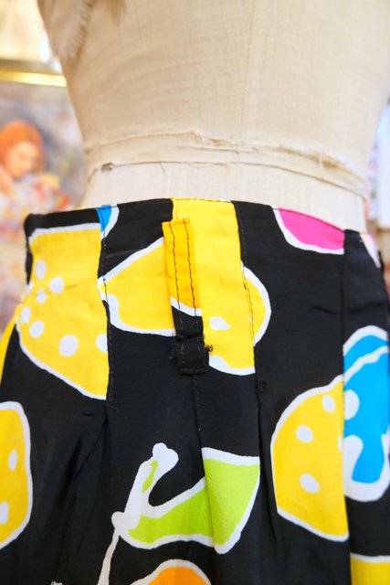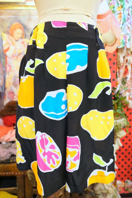 黒ベースにカラフルポップなフルーツ柄×スカートのような広がりが魅力的な1980年代頃のフランス製ヴィンテージキュロットパンツ