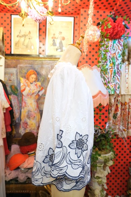 リラックスシルエットにエレガントな花柄カットワークレース×刺繍が魅力的なヨーロピアンチュニックブラウス