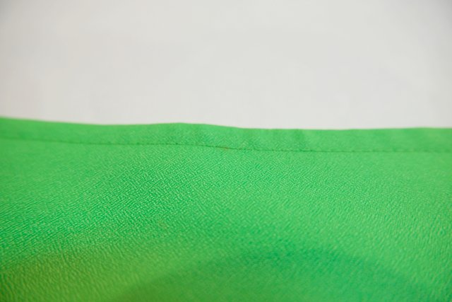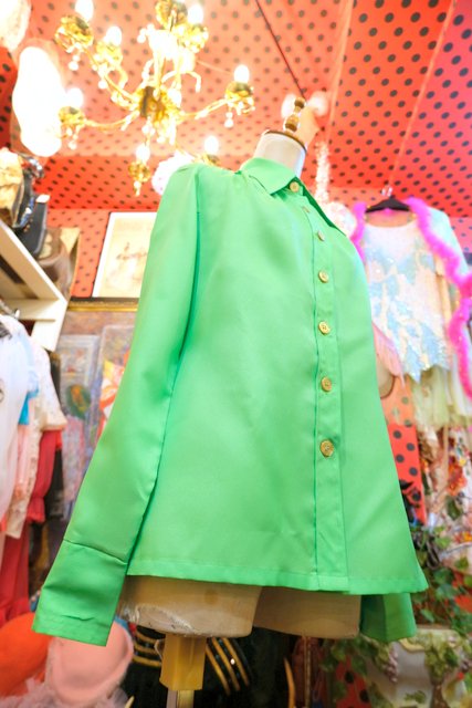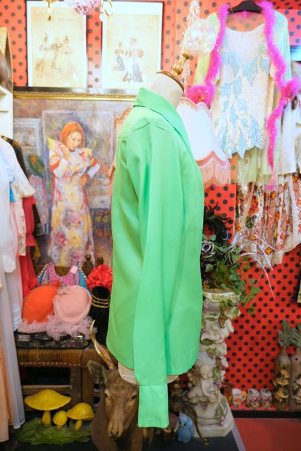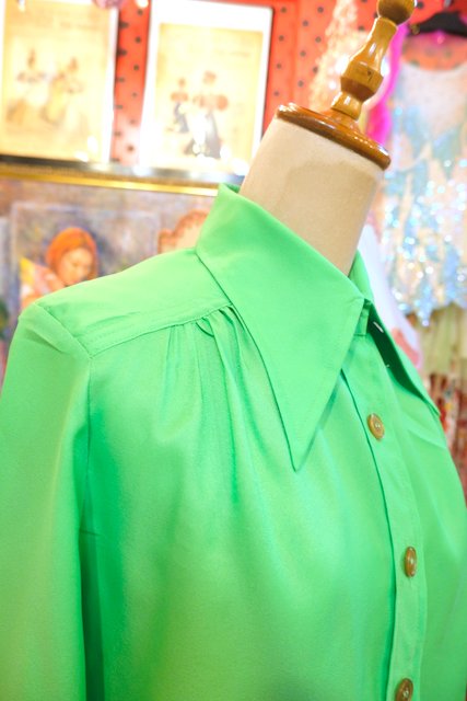 襟先が鋭くとがっているレトロデザインに鮮やかな黄緑色が目を惹く1970年代頃のヨーロピアンヴィンテージブラウス
