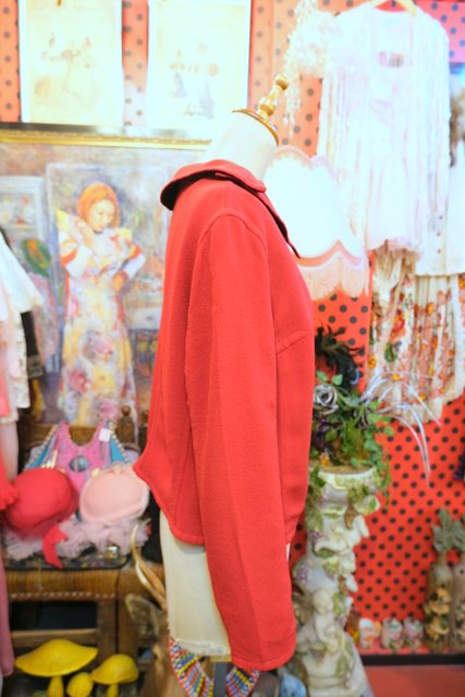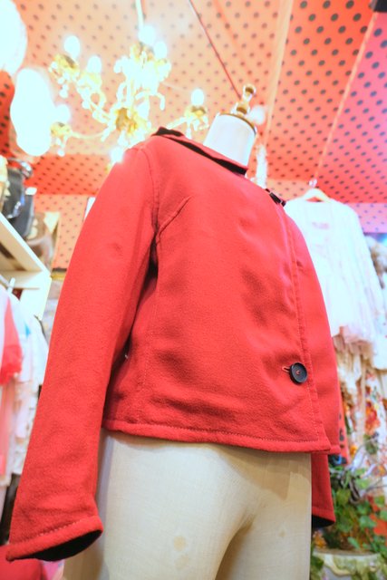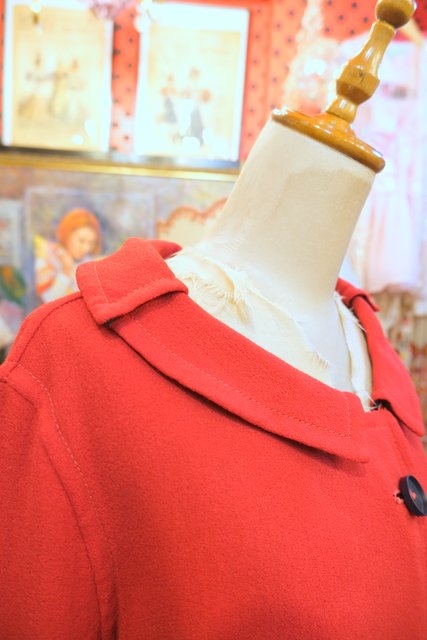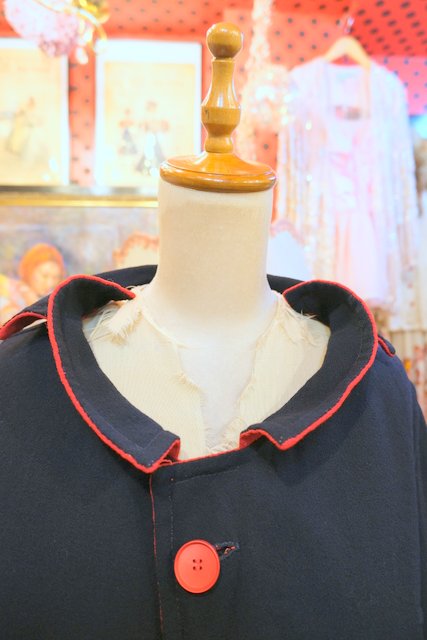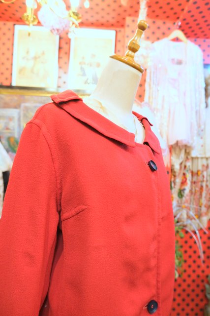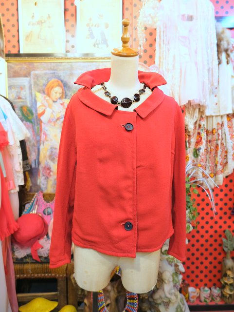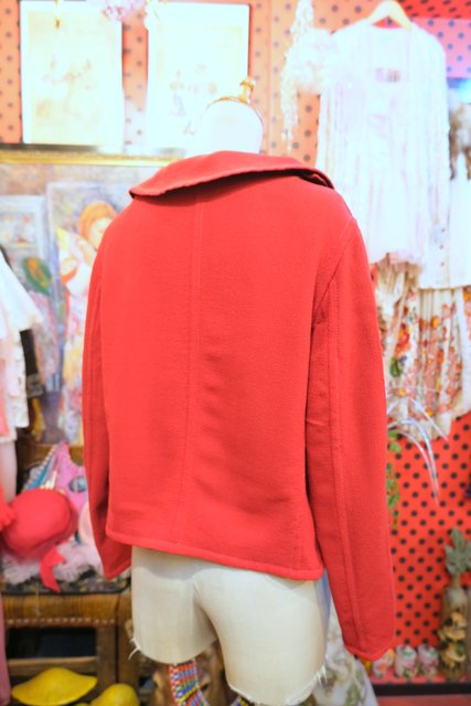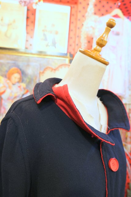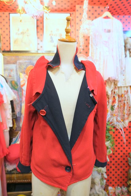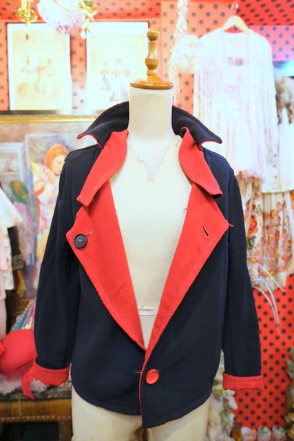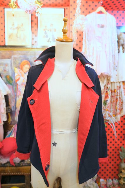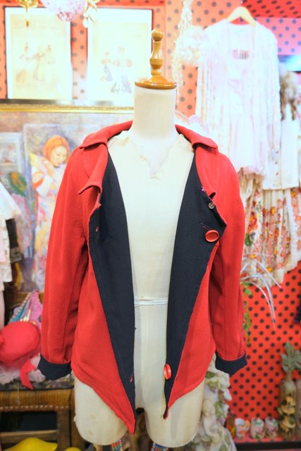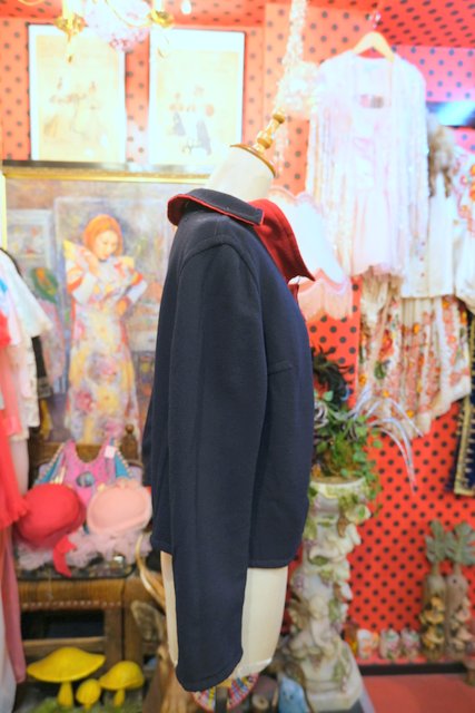 上襟と下襟が重なったシェイプドラペルカラーにレトロモダンな赤×濃紺のリバーシブルデザインが魅力的な1950年代頃のヨーロピアンヴィンテージジャケット 色々アレンジできるお洒落アイテム!