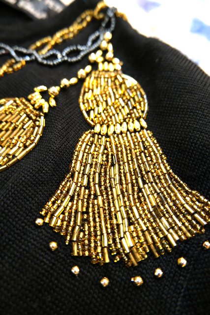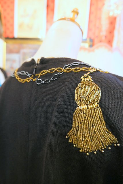 タイトなシルエットに首周りのゴージャスなビーズタッセルデザインが魅力的な1980年代頃のヨーロピアンニットワンピース